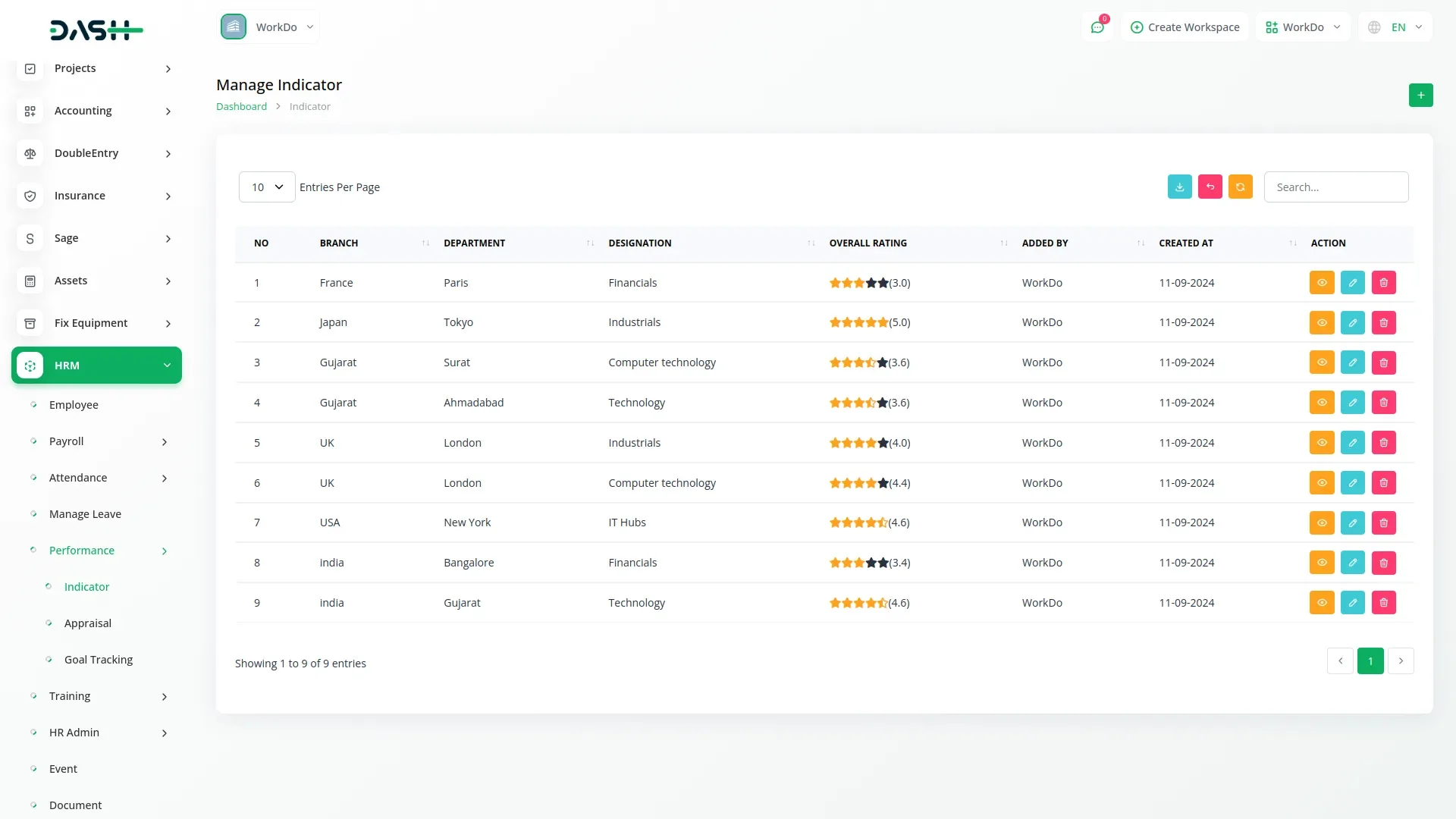 Set up performance indicators by linking a branch, department, and designation using dropdowns from your existing HRM setup. Assign a performance type and rate multiple competencies to get an overall rating. Indicators can be searched, exported, and managed from a central listview with actions like view, edit, or delete. This section ensures roles are evaluated with a clear, rating-based method.