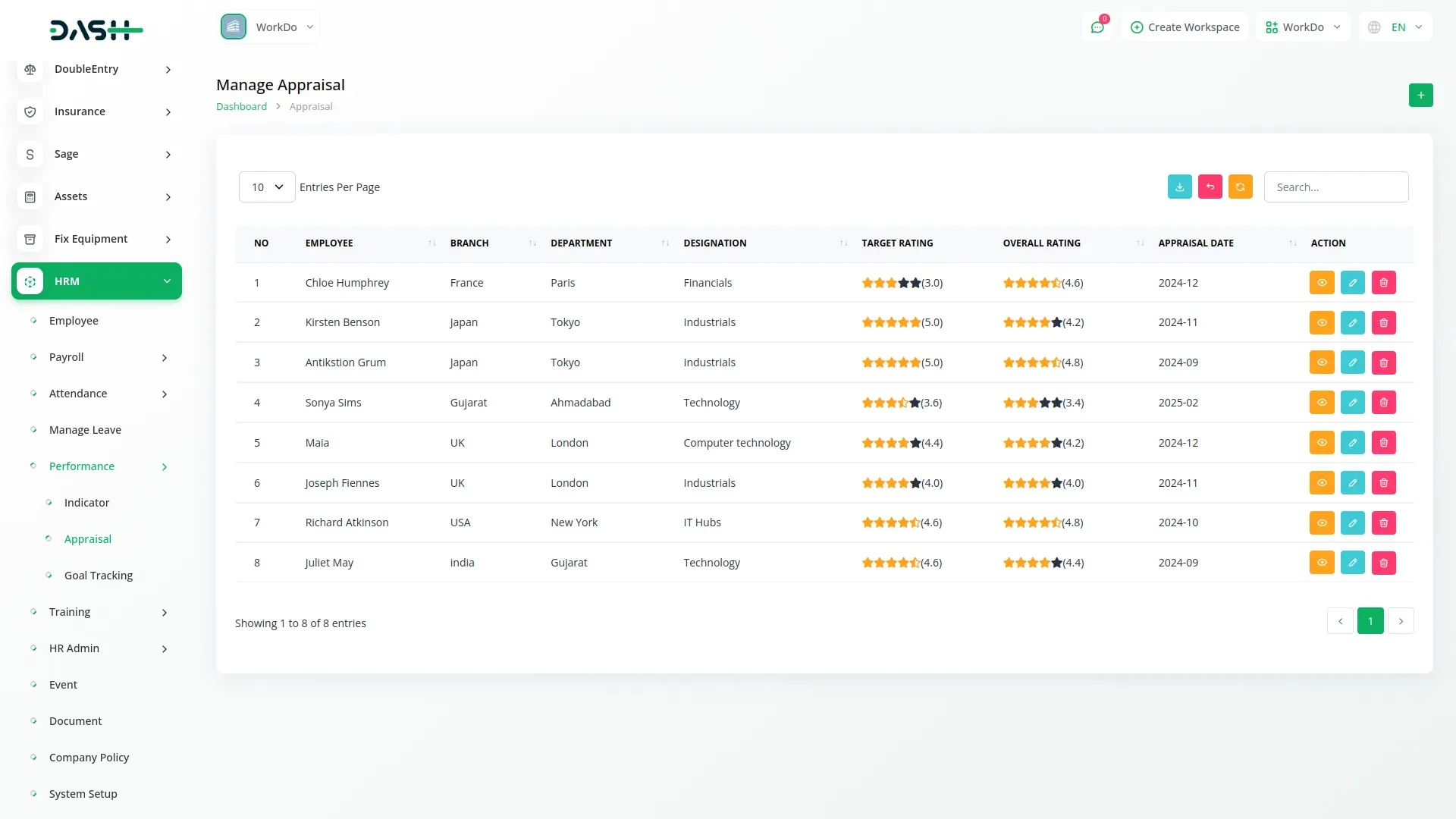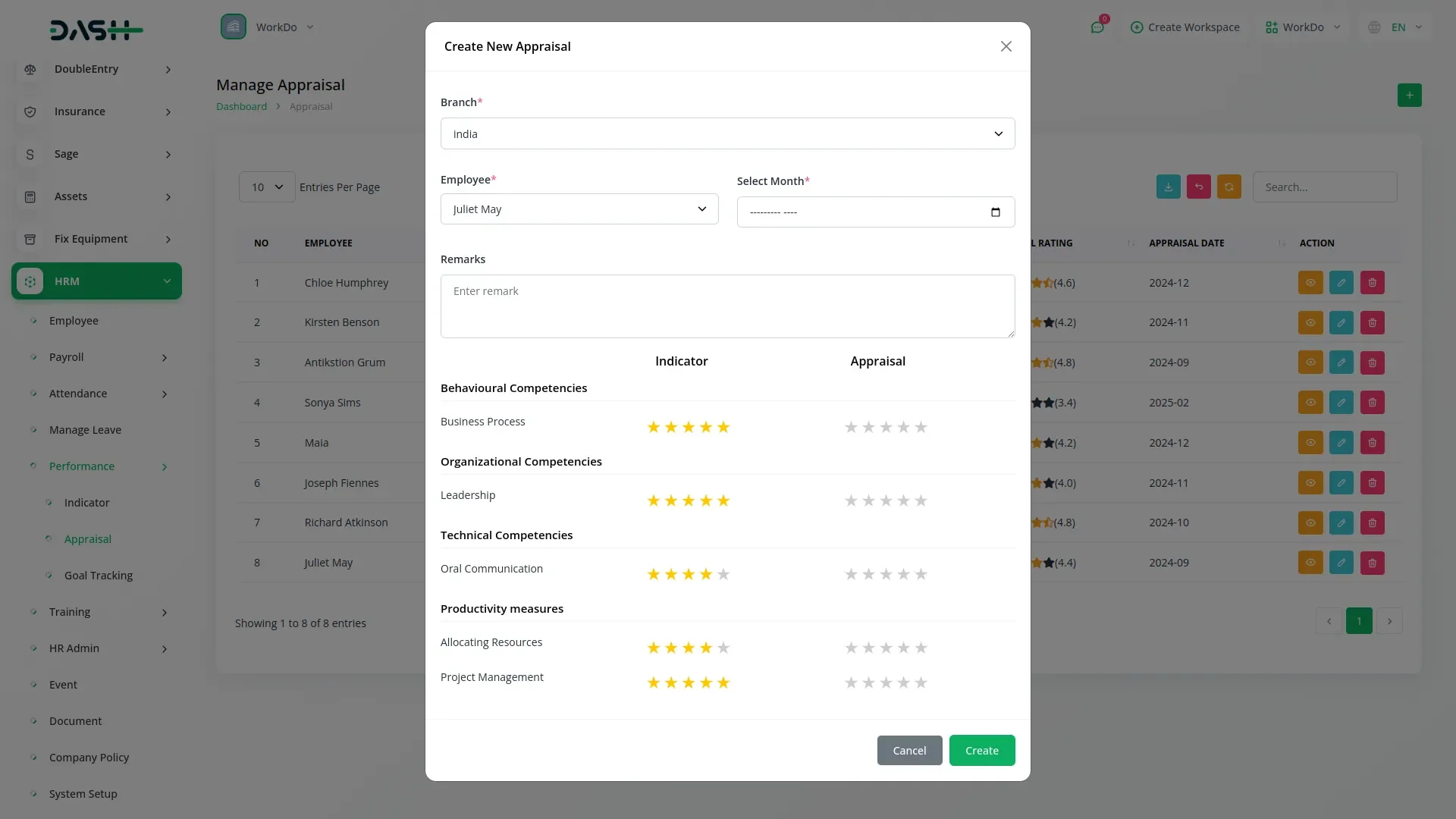 Appraise employees monthly by selecting the branch and employee from pre-existing HRM data. Record indicator ratings and final appraisal scores. Add remarks for context and track progress over time. Each appraisal entry reflects the associated department, designation, and both target and actual ratings. Actions like view, edit, and delete make this Add-On fully manageable.