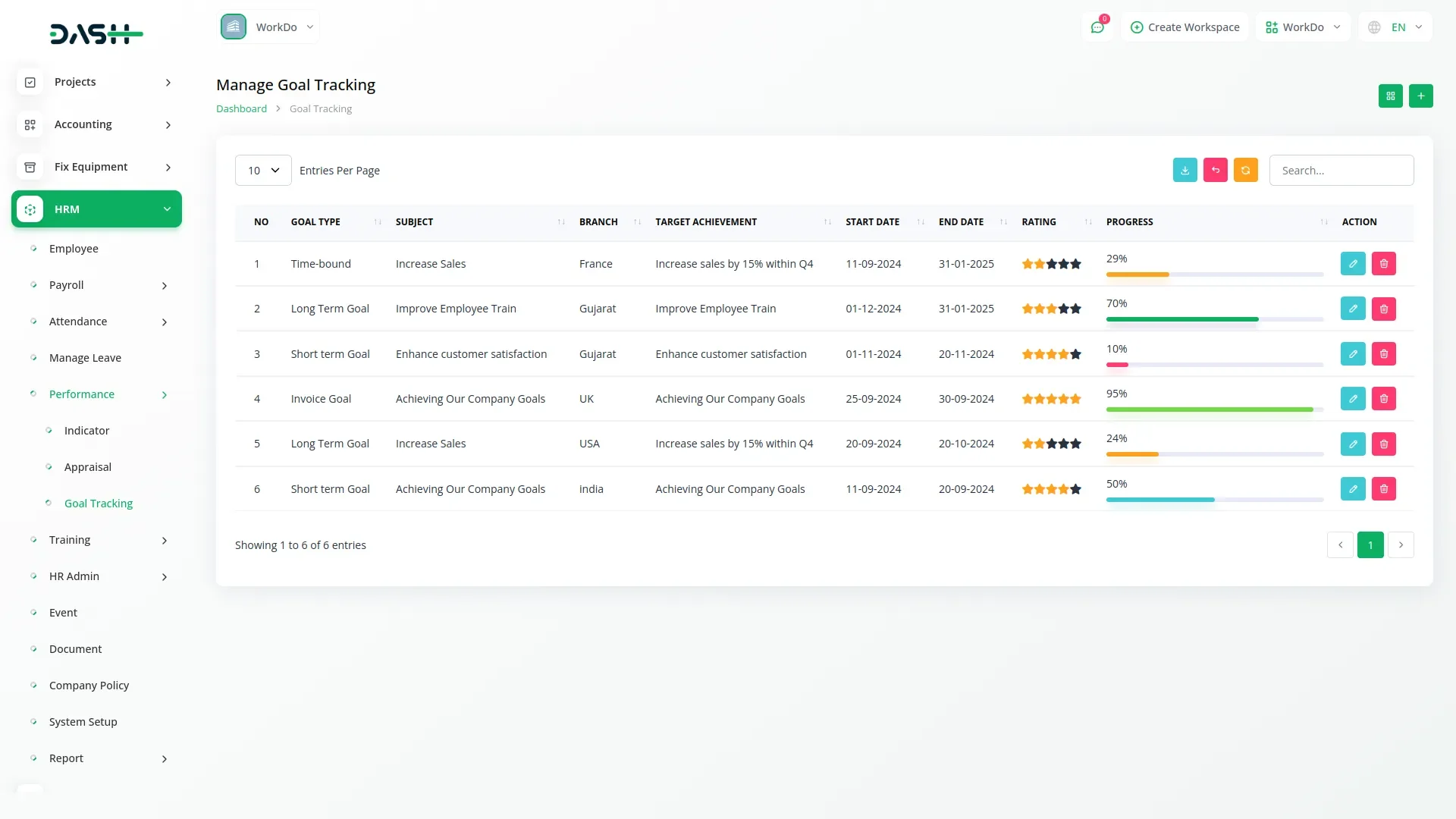 Track and manage performance goals across multiple branches with ease. Define goal types, set timelines, and assign targets for each objective. Monitor progress visually with percentage bars and star-based ratings. Switch between list and grid views for better visualization and control. Ensure alignment with company objectives through structured tracking.