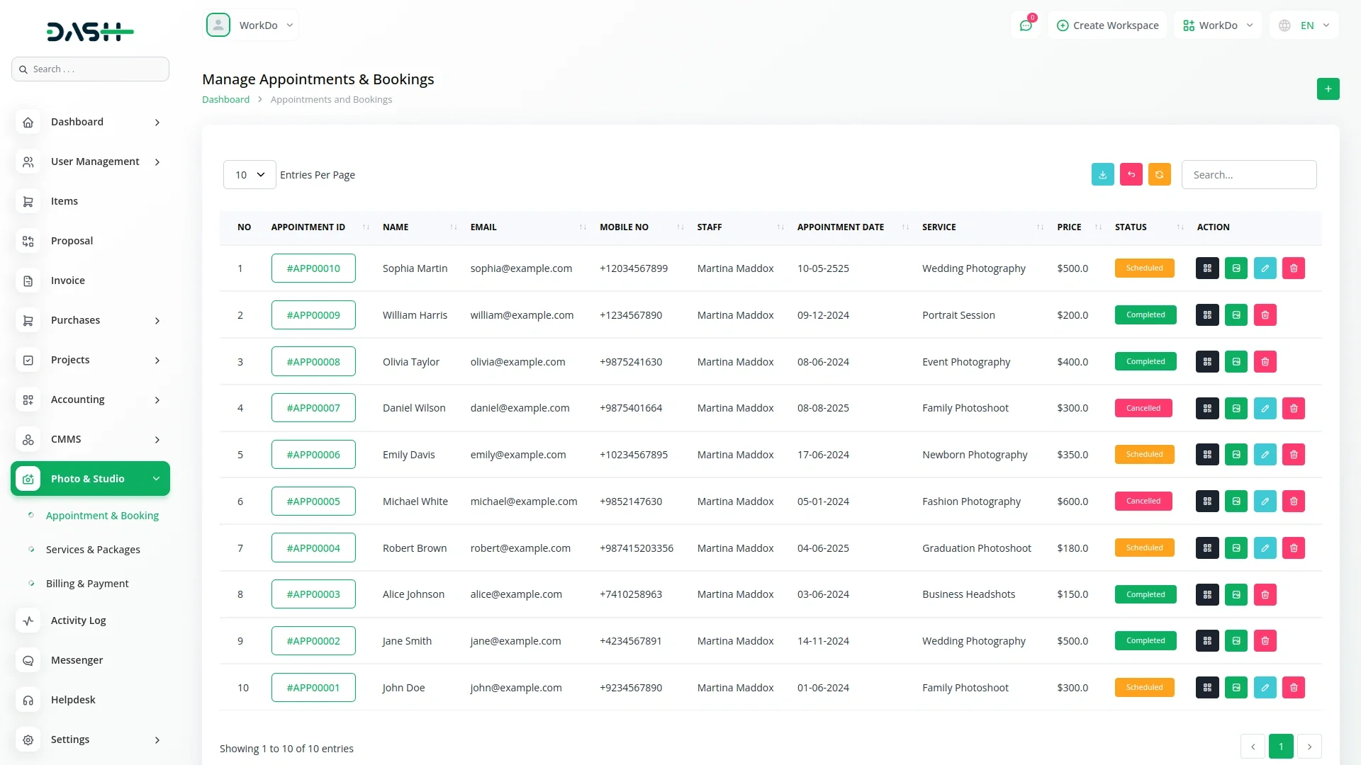 This all-in-one photo studio management system streamlines every aspect of running a photography business. From scheduling client appointments and managing a variety of photography services to allocating staff and tracking service pricing, everything is centralized for efficiency. The system ensures seamless billing and payments and receipt tracking. Status updates provide real-time progress monitoring, while secure image storage allows for easy access and delivery of photographs. Multiple workspaces can be managed separately, ensuring smooth operations for studios with different locations or teams.