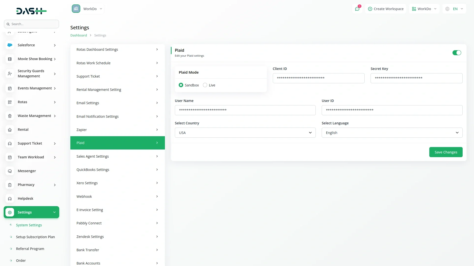 Getting started with the Plaid Add-On is a smooth process. You simply need to head over to the settings panel, locate the system settings, and find the Plaid integration option. From there, it's just a matter of entering a few essential credentials—like the Client ID, Secret Key, User Name, and User ID. You also select your preferred country and language, making it easy to tailor the setup to your region and team. All sensitive credentials are managed securely, and once saved, the connection is ready for use.