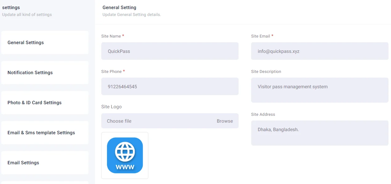 iNiLabs – Visitor Pass Management System is a system for all kind of company or business organizations. Sms gateway available (Twilio sms gateway), users can register visitors, pre-register visitors, log visitor’s check-in and check-out, employee’s and many more.
