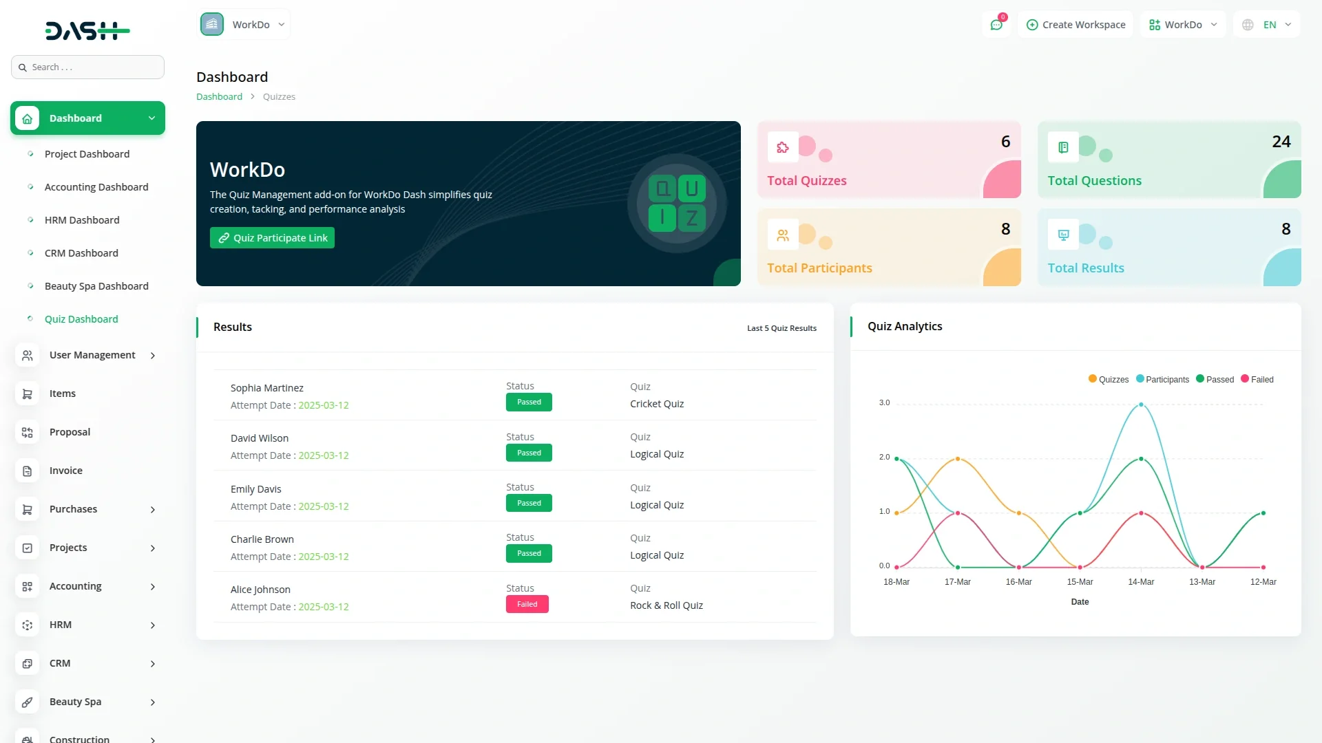 Quiz Management – Dash SaaS Add-On is a comprehensive solution for creating, managing, and evaluating quizzes and assessments across educational, training, or corporate environments. It features customizable quiz creation, question bank management, automated scoring, timed tests, and performance reports. Fully integrated with Dash SaaS, this add-on simplifies the assessment process, enhances learner engagement, and supports various formats like MCQs, true/false, and short answers.