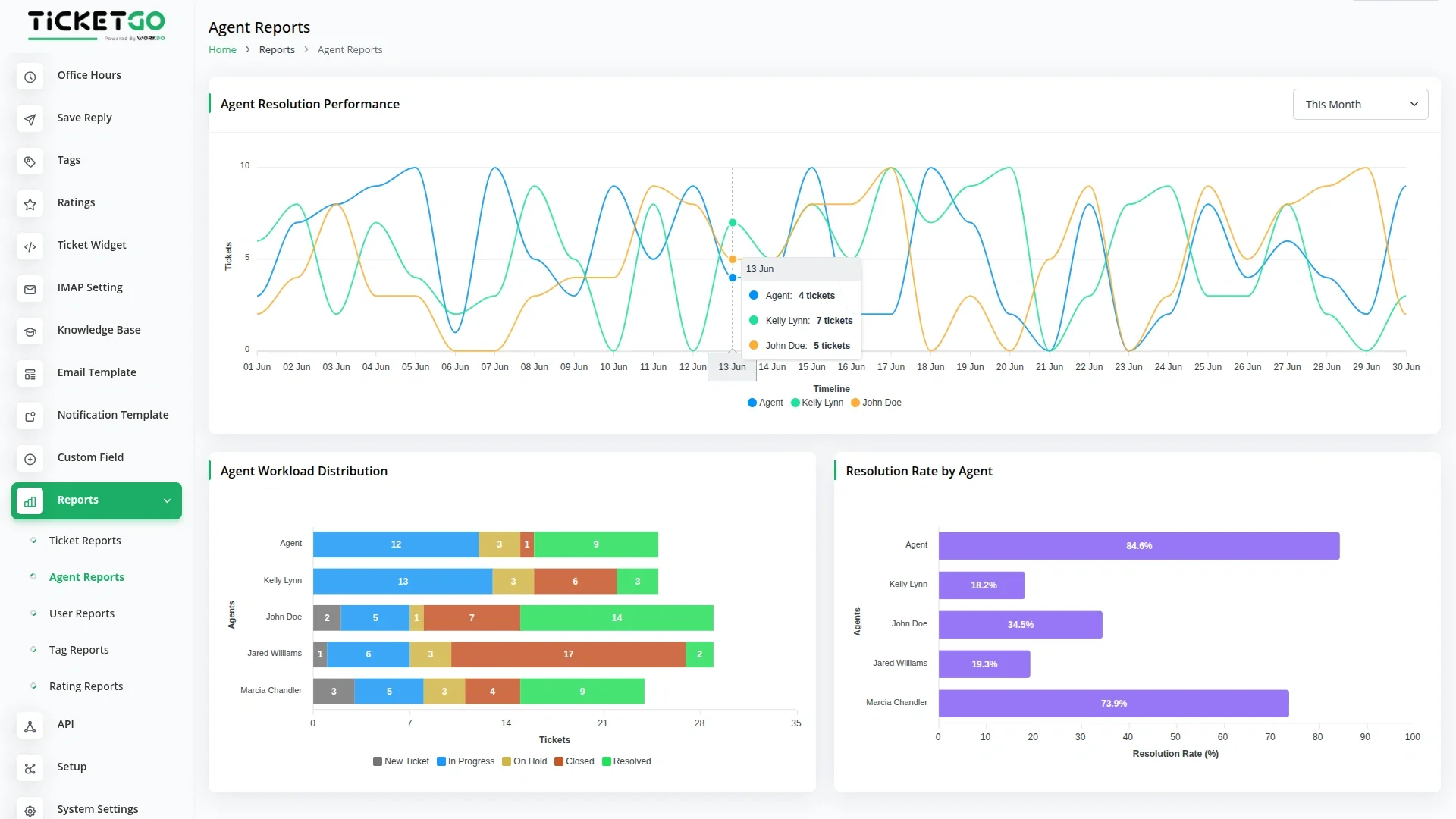 Track how well your support agents are doing with simple Agent Reports that show you everything you need to know. Get exact percentages of how many tickets each agent completes successfully, so you can praise good work and help agents who need support. You can also filter data by 7 days, this month, last month, this year, or custom dates