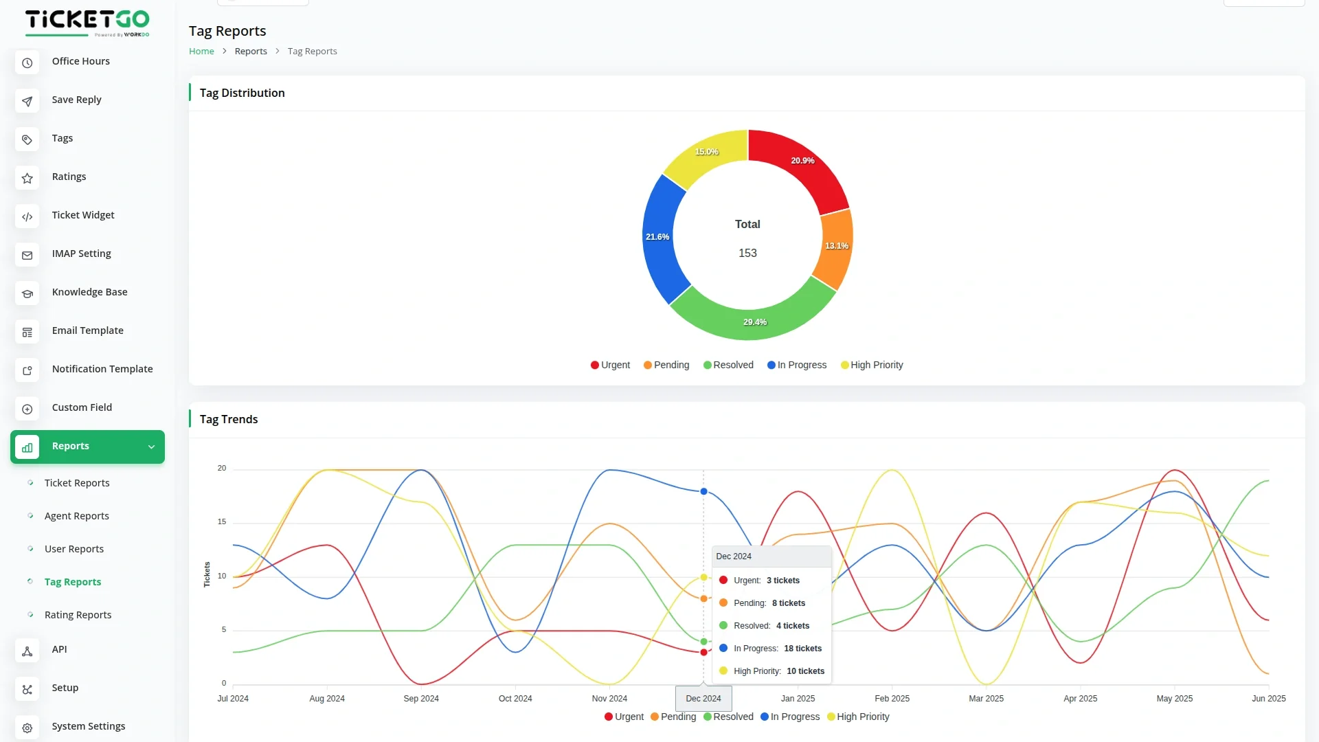 The Reports Add-On for TicketGo provides detailed insights into your support operations, helping you track performance, measure productivity, and make data-driven decisions. With easy-to-understand visual reports, you can monitor key metrics and continuously improve your customer support process.