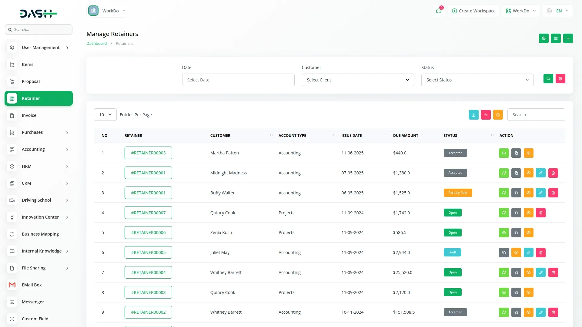 Retainer Management provides a centralized and streamlined system to create, monitor, and manage client retainers with complete visibility and control. This feature is designed to simplify your financial workflow by allowing you to efficiently handle ongoing client agreements and pre-paid service arrangements from a single, organized interface. From the centralized retainer list, you can access all existing retainers along with essential details such as client name, retainer number, amount, due date, and current status. This enables quick insights into your financial commitments and billing cycles, reducing the time spent navigating through individual records.