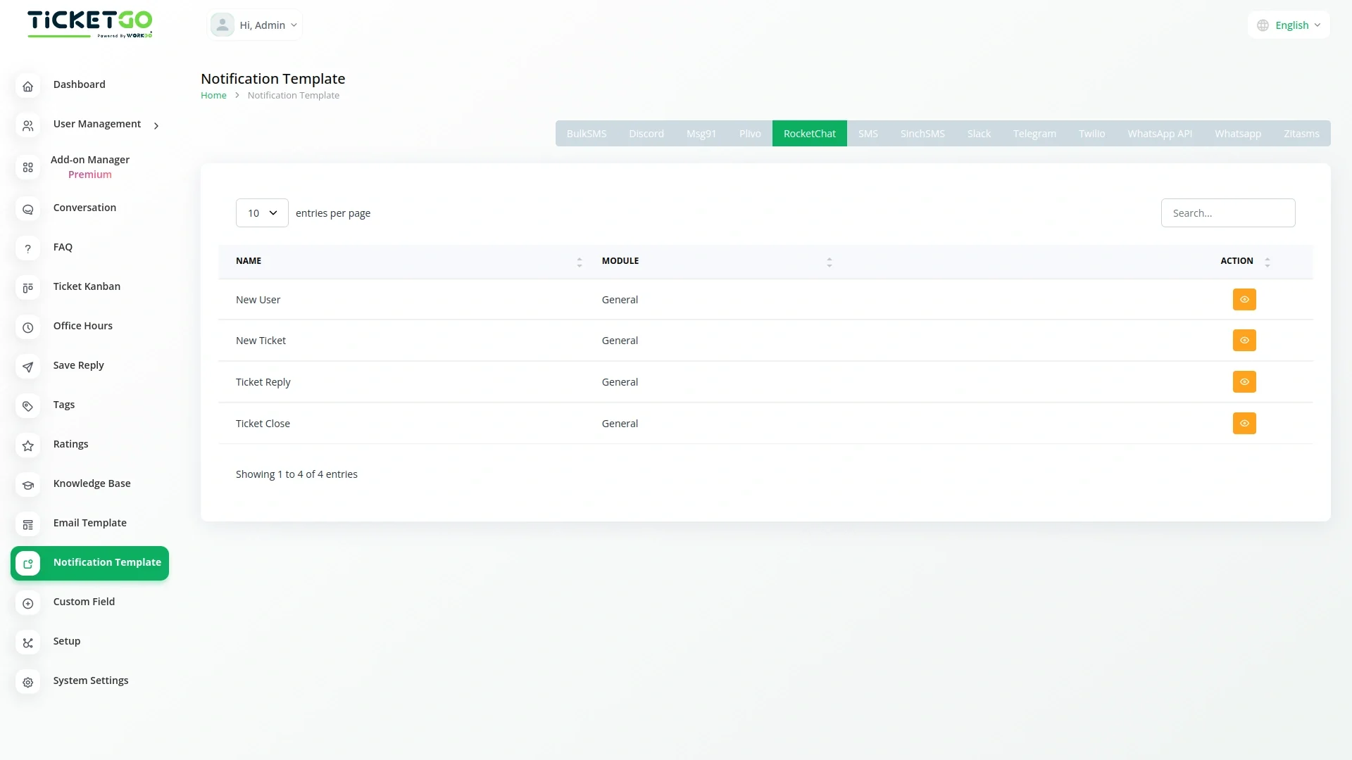Setting up RocketChat notifications in TicketGo requires configuring the integration through API credentials and linking it to your RocketChat instance. During the setup, you will define which ticket events should trigger notifications and choose the relevant RocketChat channels where these alerts will be sent. Once everything is set up, TicketGo will automatically push notifications to RocketChat based on the configured events.