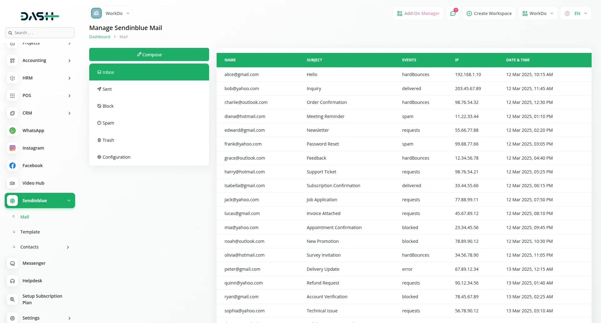 The Sendinblue integration allows businesses to streamline their email communication by composing and managing emails directly from the platform. Whether sending newsletters, promotional emails, or transactional messages, users can draft new emails within Dash SaaS, which are then sent via Brevo. This ensures a smooth workflow while maintaining professional and efficient outreach to clients and customers.
