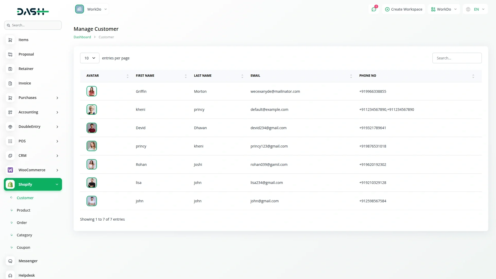 Once the connection is active, you can view all your Shopify customers directly from the side menu. Their information, such as name, contact details, and email, is synced automatically, so you do not need to log in to Shopify every time. Along with customers, the Add On also brings in your store’s coupon data. You can view all the available coupon codes, their discount types, and usage details right inside your system. This helps you manage customer data and ongoing offers with ease.