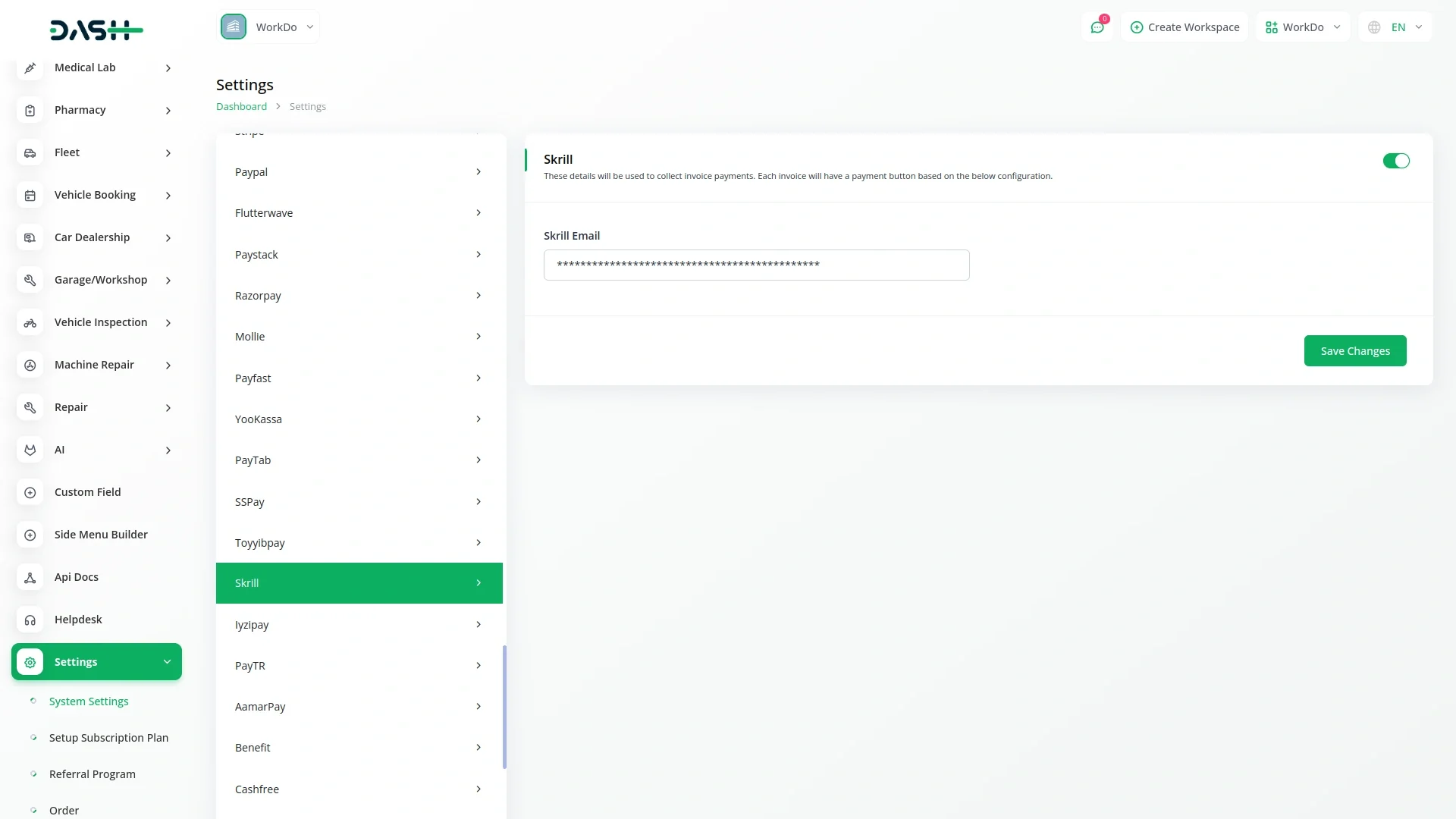 Skrill – Dash SaaS Add-On. This add-on enables seamless Skrill payment gateway integration, allowing users to accept payments through credit/debit cards, digital wallets, and international transfers. Ideal for SaaS platforms targeting global audiences, Skrill supports multi-currency transactions and low-cost cross-border payments. Enhance your SaaS billing system with Skrill’s trusted and flexible payment solution.