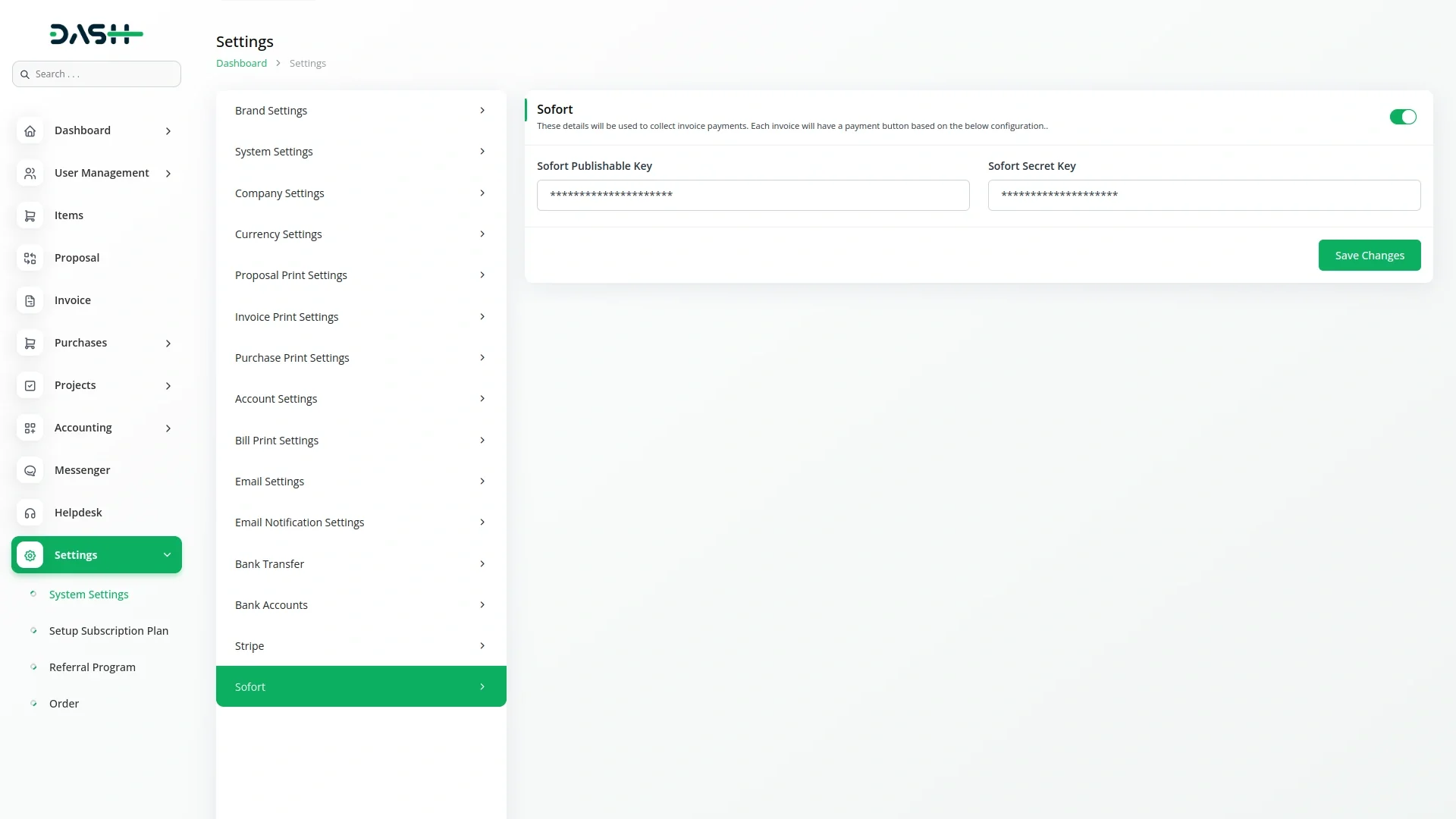 The API Key Settings Page for Sofort Integration allows you to securely connect your application or website with the Sofort payment gateway. By configuring your API keys on this page, you enable your platform to interact with Sofort services, providing seamless payment processing and transaction management. Both Superadmin and Company accounts can utilize this integration, though each has a specific focus. The Superadmin integration is primarily for handling subscription-based payments, while the Company integration handles payments related to invoices and other one-time transactions. Both roles share the same integration setup, ensuring ease of use and consistency across the platform.