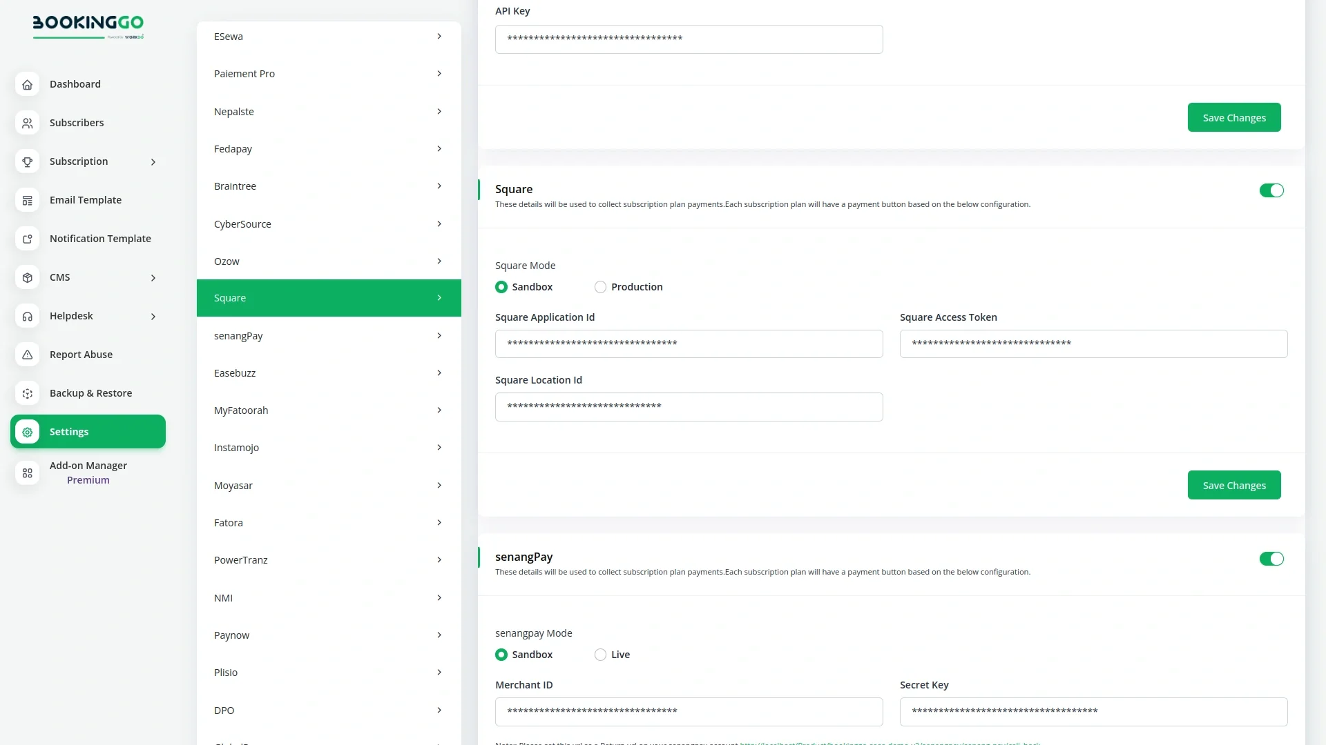 The API Key Settings Page for Square Integration enables you to securely connect your application or website with the Square payment gateway. Configuring your API keys on this page facilitates seamless interactions with Square services, supporting smooth payment processing and transaction management. Both Superadmin and Company accounts can leverage this integration, tailored to their specific requirements.