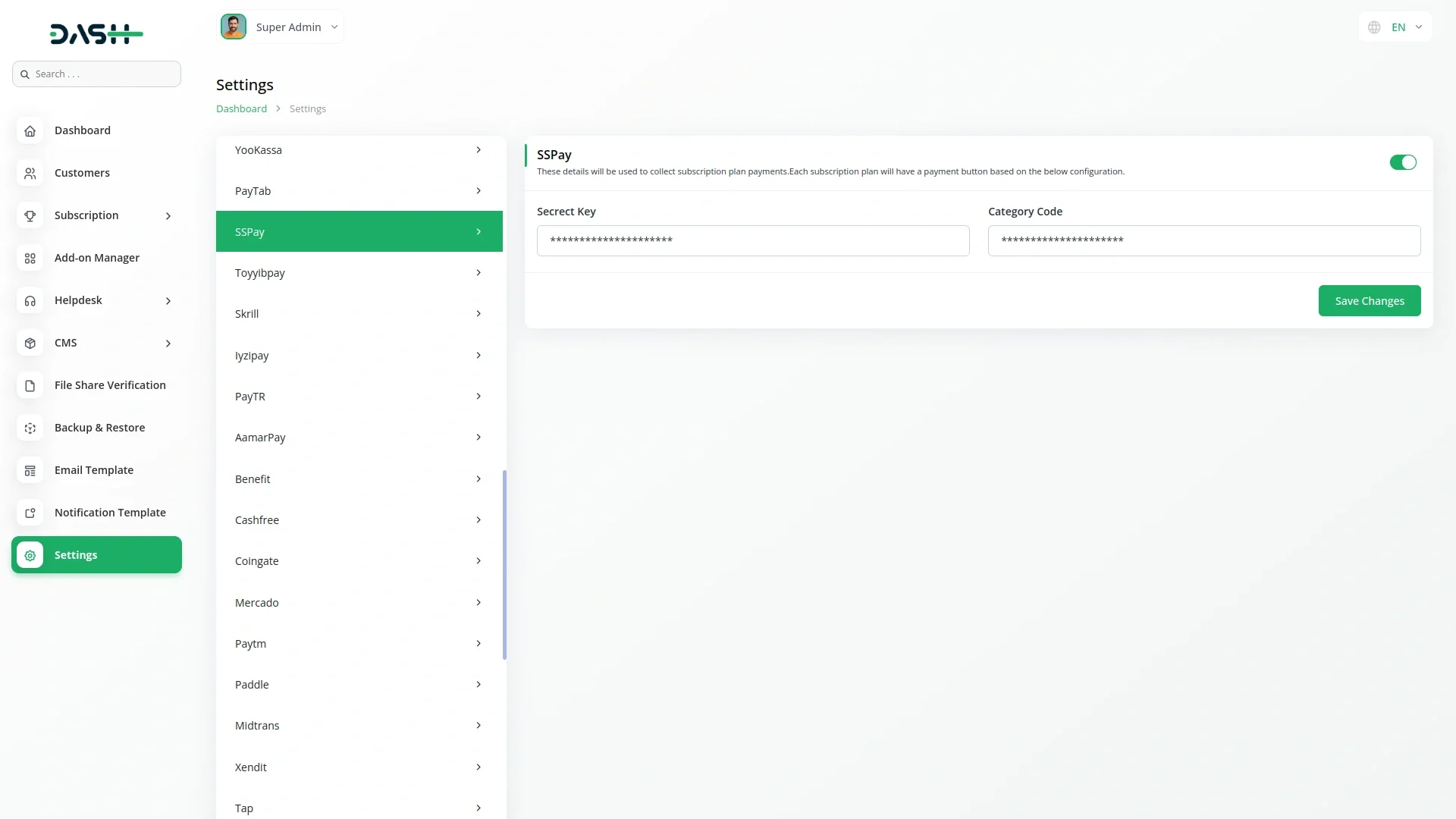 The API Key Settings Page for SSPay Integration allows you to connect your application or website securely with the SSPay payment gateway. By configuring your API keys on this page, you enable your platform to interact with SSPay services, providing seamless payment processing and transaction management. Both Superadmin and Company accounts can utilize this integration, though each has a specific focus. The Superadmin integration is primarily for handling subscription-based payments, while the Company integration handles payments related to invoices and other one-time transactions. Both roles share the same integration setup, ensuring ease of use and consistency across the platform.