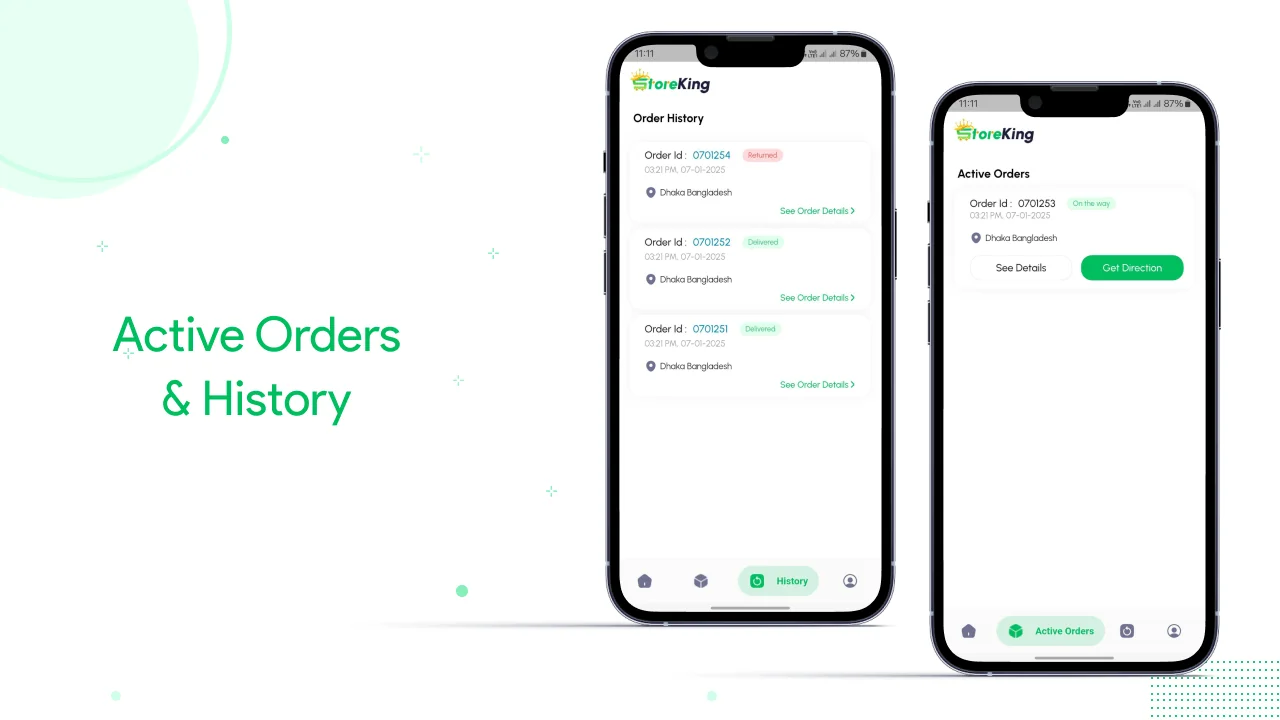 StoreKing enables delivery agents to receive new order alerts, view pickup and drop-off details, navigate using integrated maps, update order status, track earnings, and manage daily delivery tasks effortlessly. The app syncs seamlessly with the StoreKing eCommerce backend, providing accurate order information, location tracking, and performance analytics.