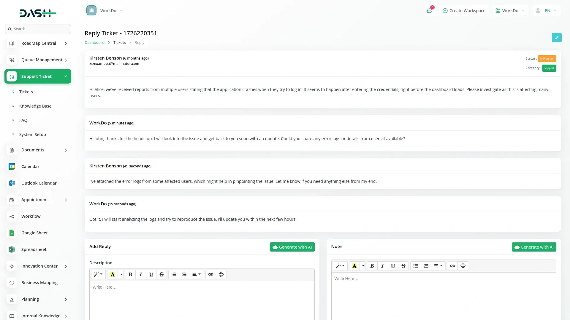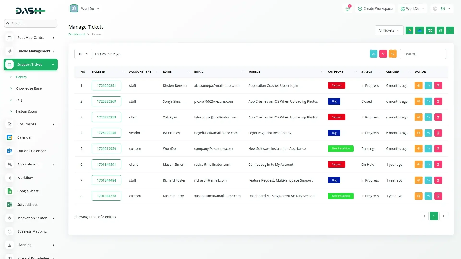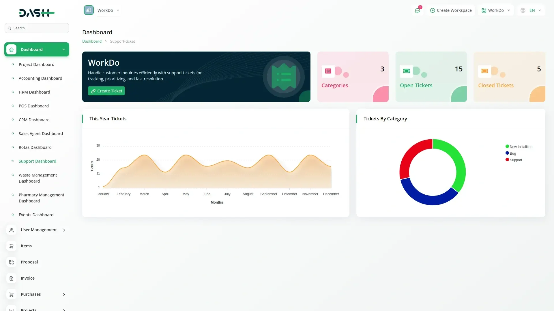 The Support Ticket – WorkDo Dash SaaS Operation Add-On enhances your SaaS platform by enabling users to submit, track, and manage support tickets with ease. Featuring threaded replies, file attachments, dynamic forms, and a categorized FAQ-based knowledge base, this add-on streamlines customer support and internal operations—boosting efficiency, communication, and reducing repetitive queries through self-service support tools.