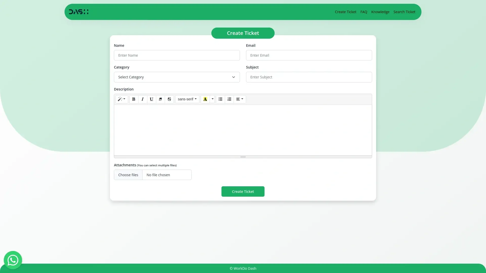 Users can submit tickets by entering their name, email, subject, and account type. Each ticket is assigned a unique ID, and users can describe their issue in detail and upload attachments for better clarity.
