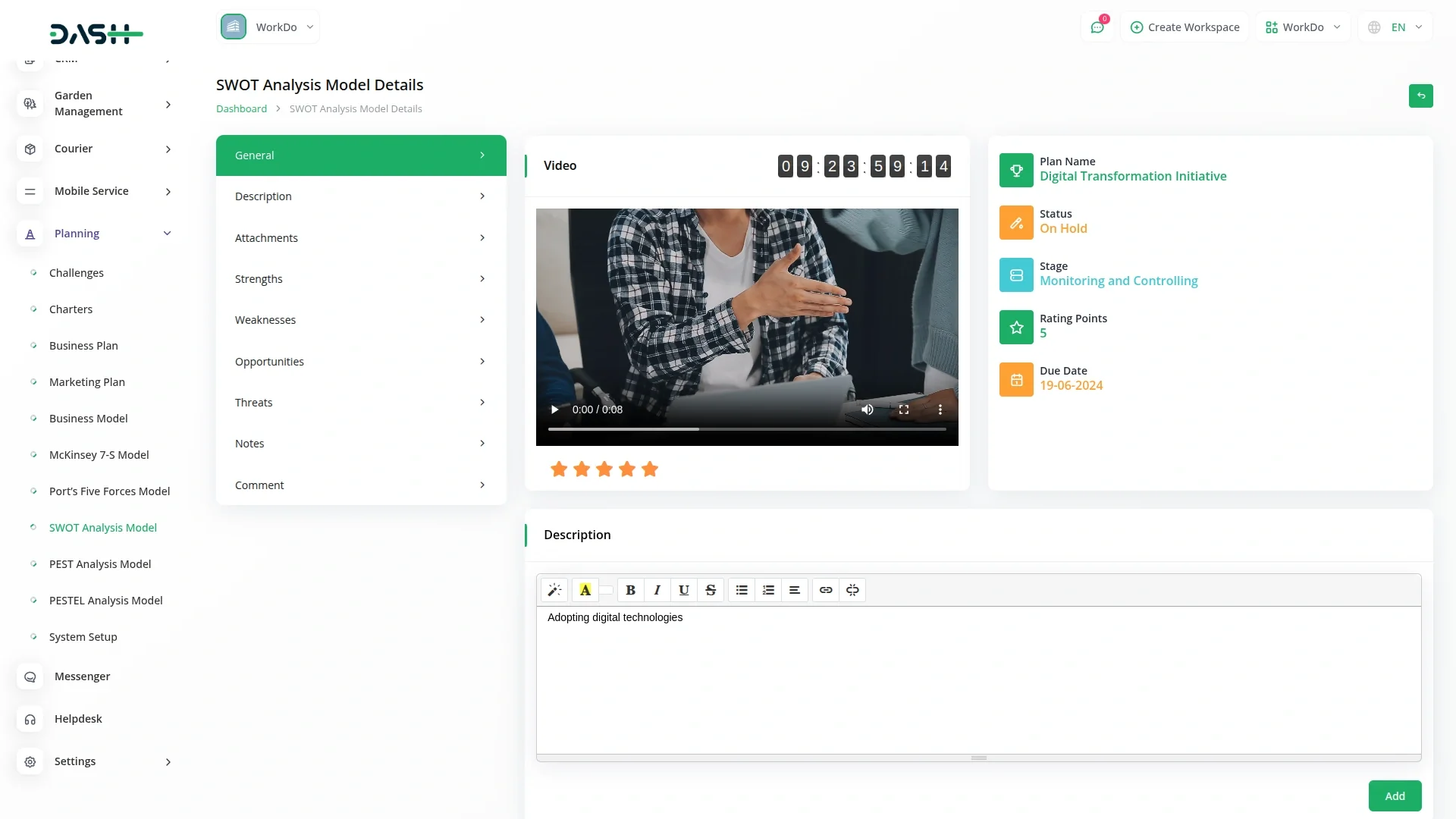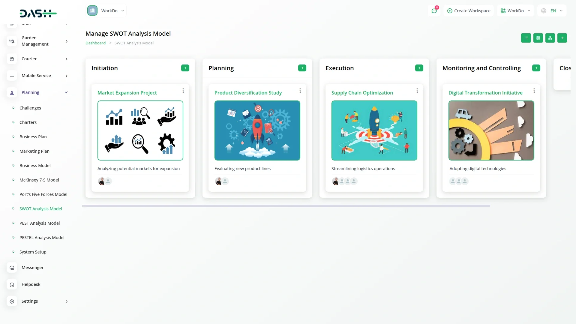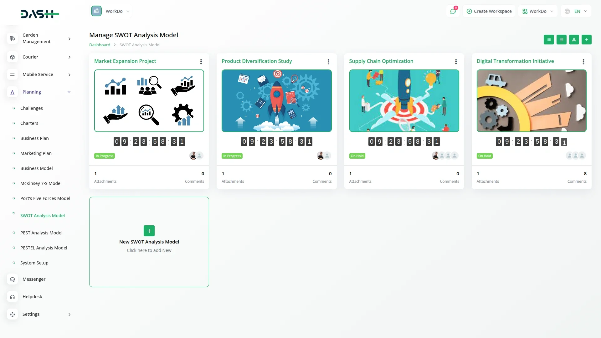 Gain a comprehensive view of your SWOT Analysis Models in an intuitive grid format. This section displays key details like strengths, weaknesses, opportunities, and threats, along with essential data such as comments, attachments, challenge end time, and assigned users. With the ability to print, edit, or delete models, this feature allows you to efficiently manage and update your SWOT analysis for actionable insights.