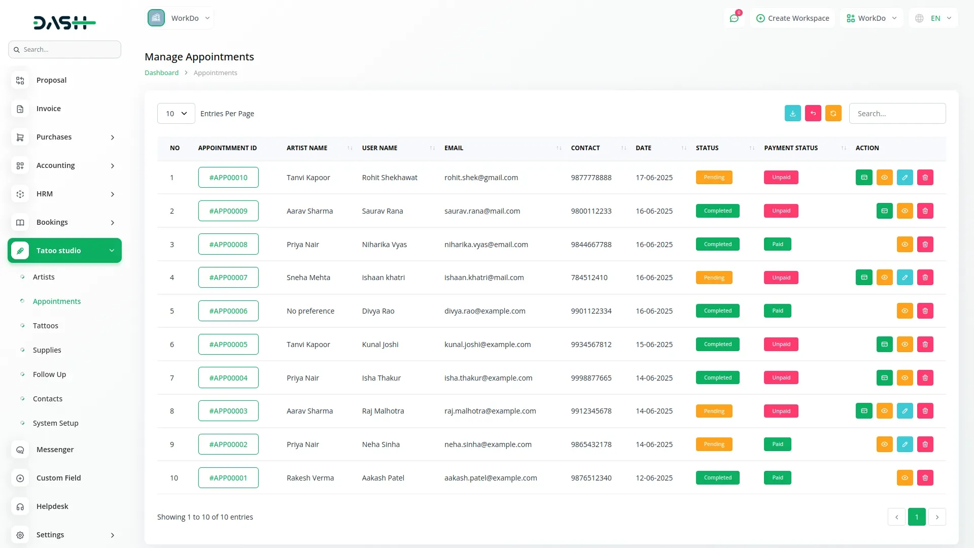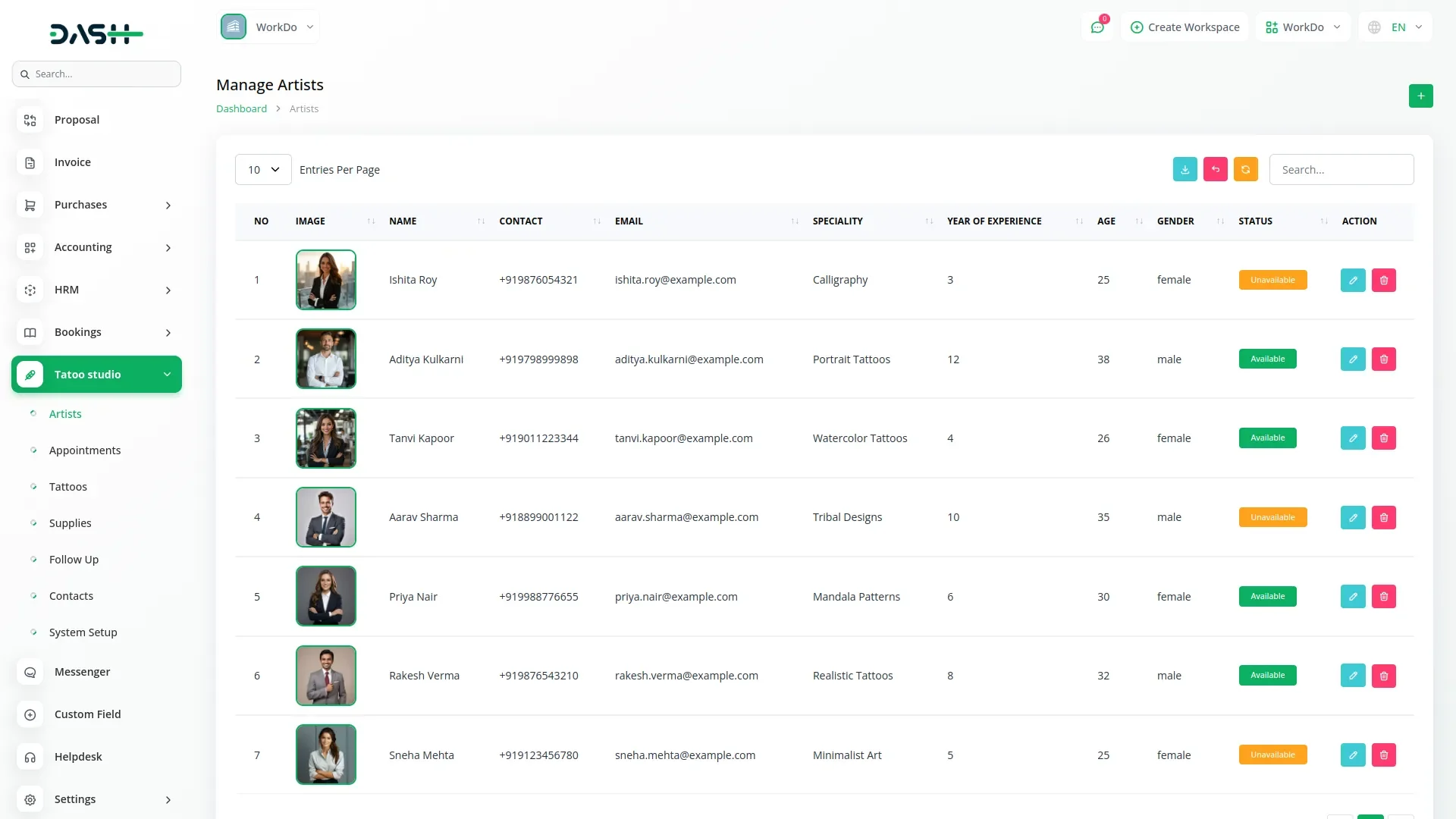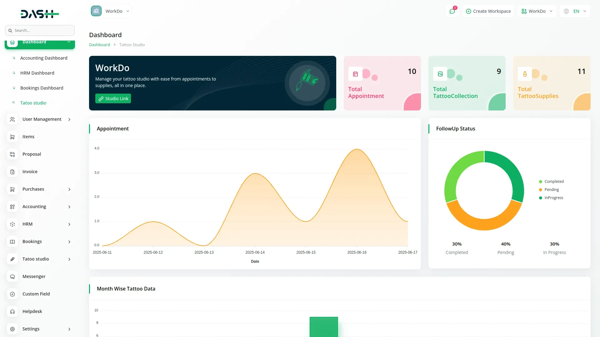 Tattoo Studio Management – Dash SaaS Add-On is a specialized solution crafted to streamline operations for tattoo parlors and body art studios. This add-on offers comprehensive features such as appointment scheduling, client consultation records, artist portfolio management, session tracking, inventory for inks and supplies, and integrated billing. With built-in CRM tools, consent form storage, and aftercare tracking, this module ensures a professional, safe, and organized experience for both clients and artists.