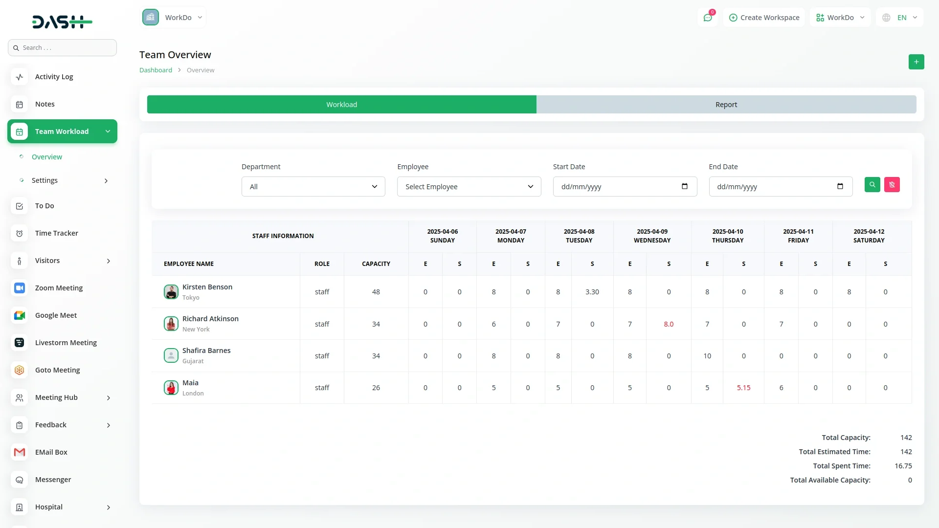 This Team Workload Add-On helps manage employee workloads efficiently within each workspace. Admins can assign individual working capacities, define schedules, and configure holidays to ensure accurate planning. Employees can submit daily timesheets with hours, minutes, and task notes, making it easy to track progress. If an employee logs more time than estimated, the extra hours are automatically highlighted in red. With flexible staff settings and workspace-level control, it supports organized and accountable team operations.