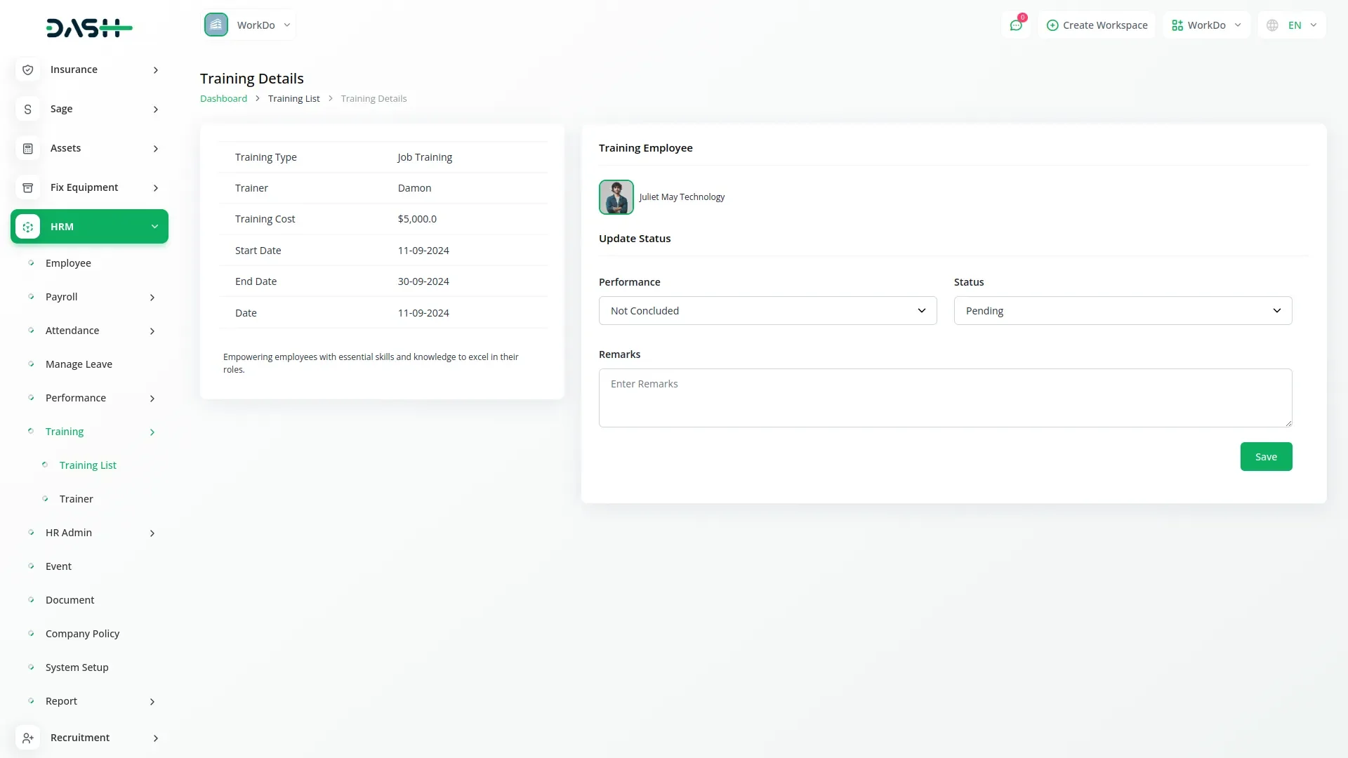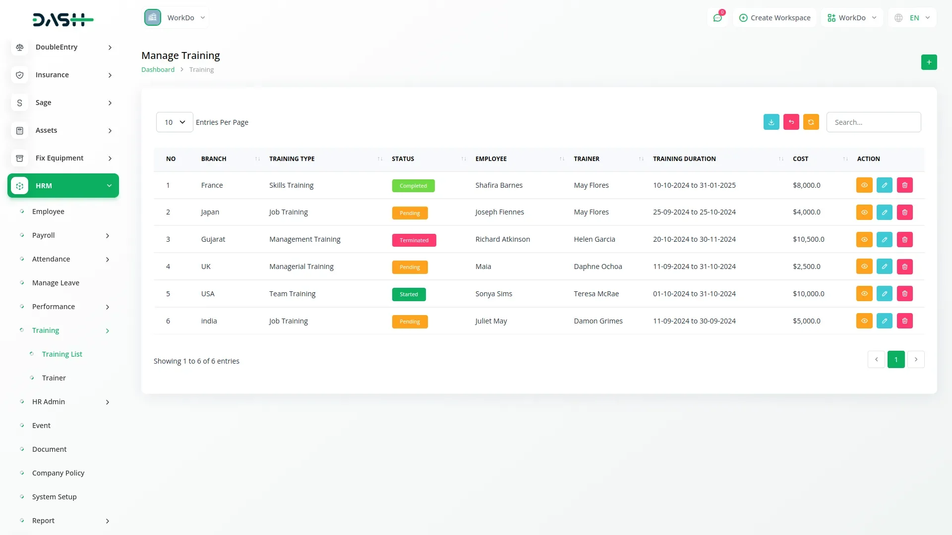 The Training Details interface provides a comprehensive view of individual training sessions, displaying essential information such as training type, schedule, costs, and employee assignments. Users can track training progress through detailed employee lists, monitor attendance, and manage training logistics including dates, duration, and associated expenses. The system maintains complete training records with employee profiles, performance tracking, and status updates, ensuring effective training administration and accountability across the organization.