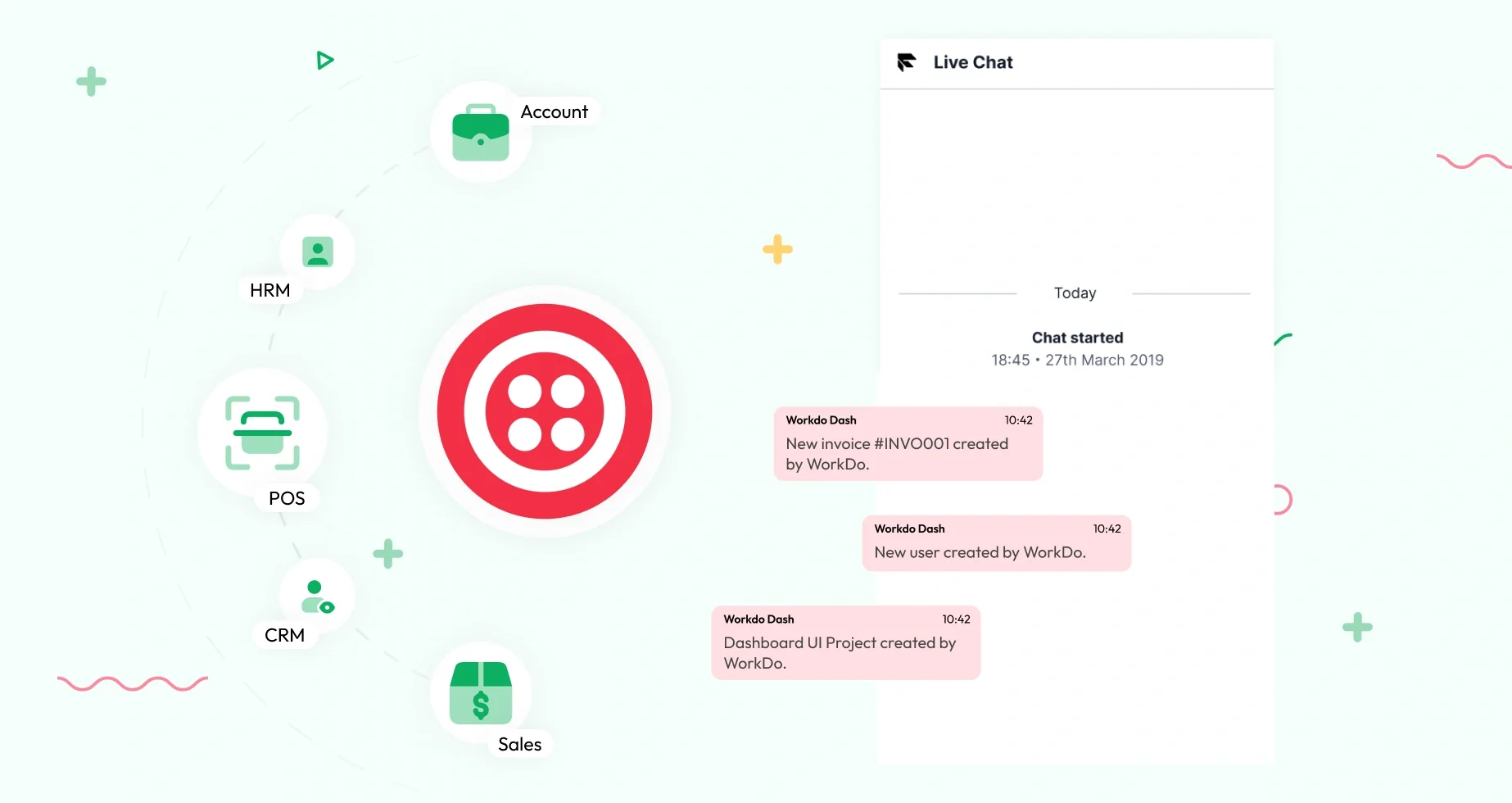 This visual highlights a powerful integration that connects various business functions with instant notifications. From managing sales, CRM, and mobile services to handling cleaning, waste management, and car dealerships, every aspect is streamlined for efficiency. Automated updates ensure users receive real-time information, enhancing productivity and engagement.
