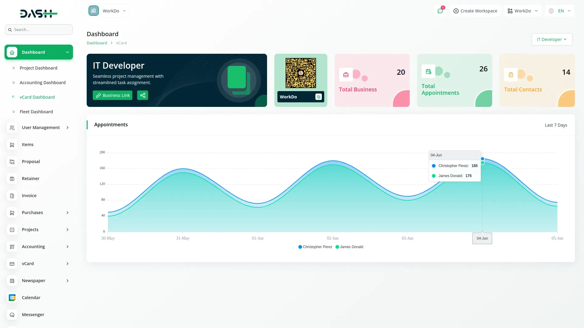 This powerful Add-On lets users create fully customizable digital business cards with 21 themes, custom domains, and personalized content blocks. It includes advanced tools like SEO, QR code sharing, PWA support, and secure payment integration. Users can efficiently manage appointments, contacts, and business performance through interactive dashboards and calendar views.