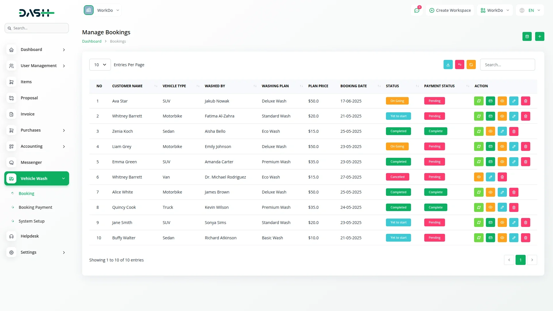 The Vehicle Wash Add-On offers a seamless booking workflow designed to maximize efficiency and improve customer satisfaction. Users can easily create new bookings by specifying customer type (walk-in or registered client), entering personal details, selecting vehicle types, and choosing from available washing plans with automatic price calculation. The system tracks booking status through multiple stages (Yet to Start, On Going, Completed, or Cancelled) and maintains payment records for each transaction.