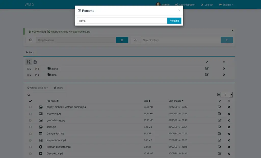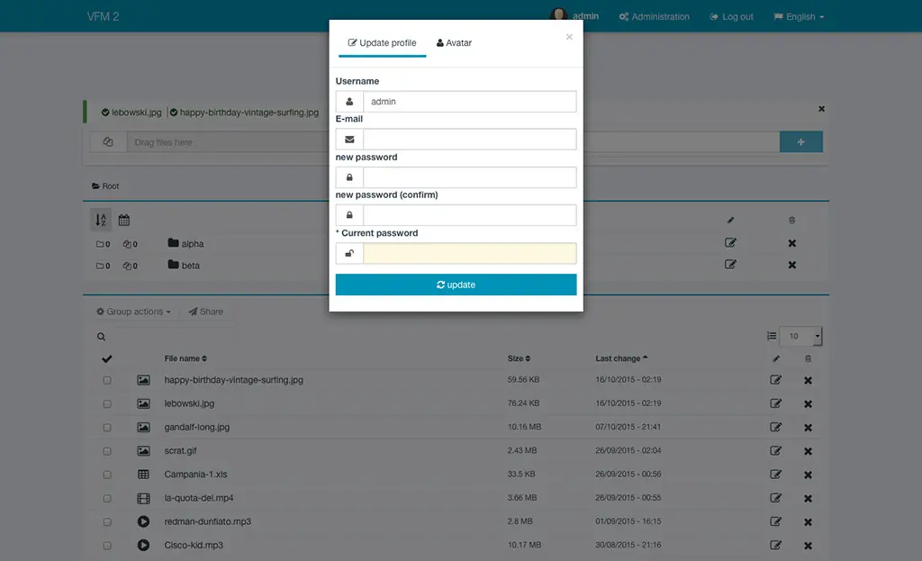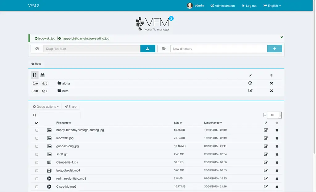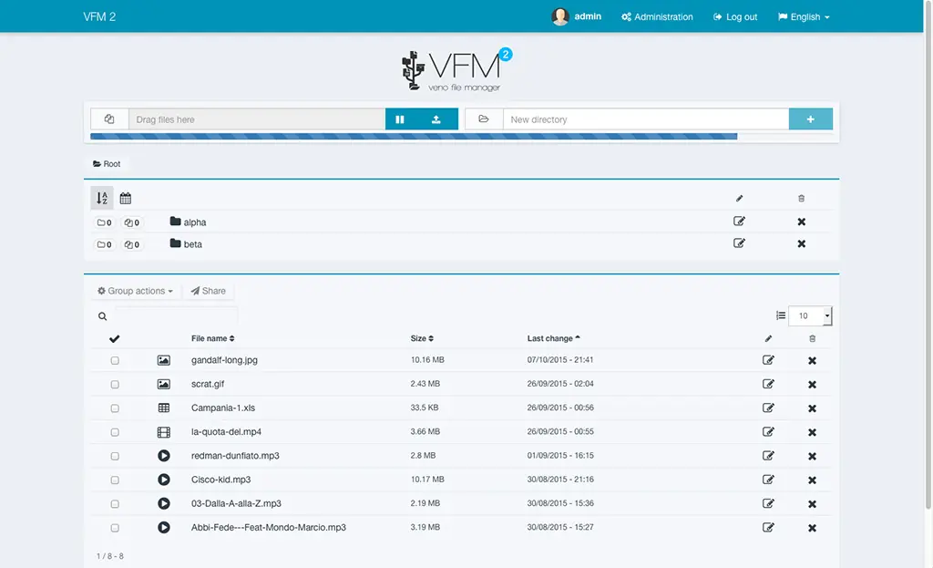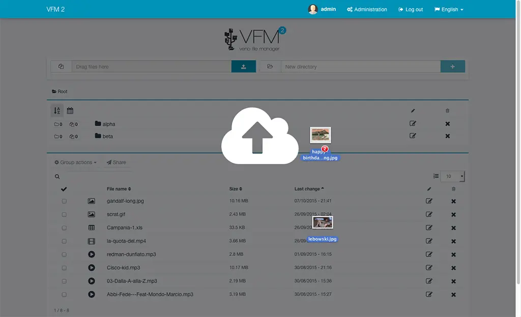 VFM is a simple and flexible plug-and-play file manager, easy to use and plenty of options. Send files to your customers, create new users with dedicated folders, or simply use it as your personal file cloud. Access from any device, manage users and general settings from an intuitive administration panel, customize it to your brand.