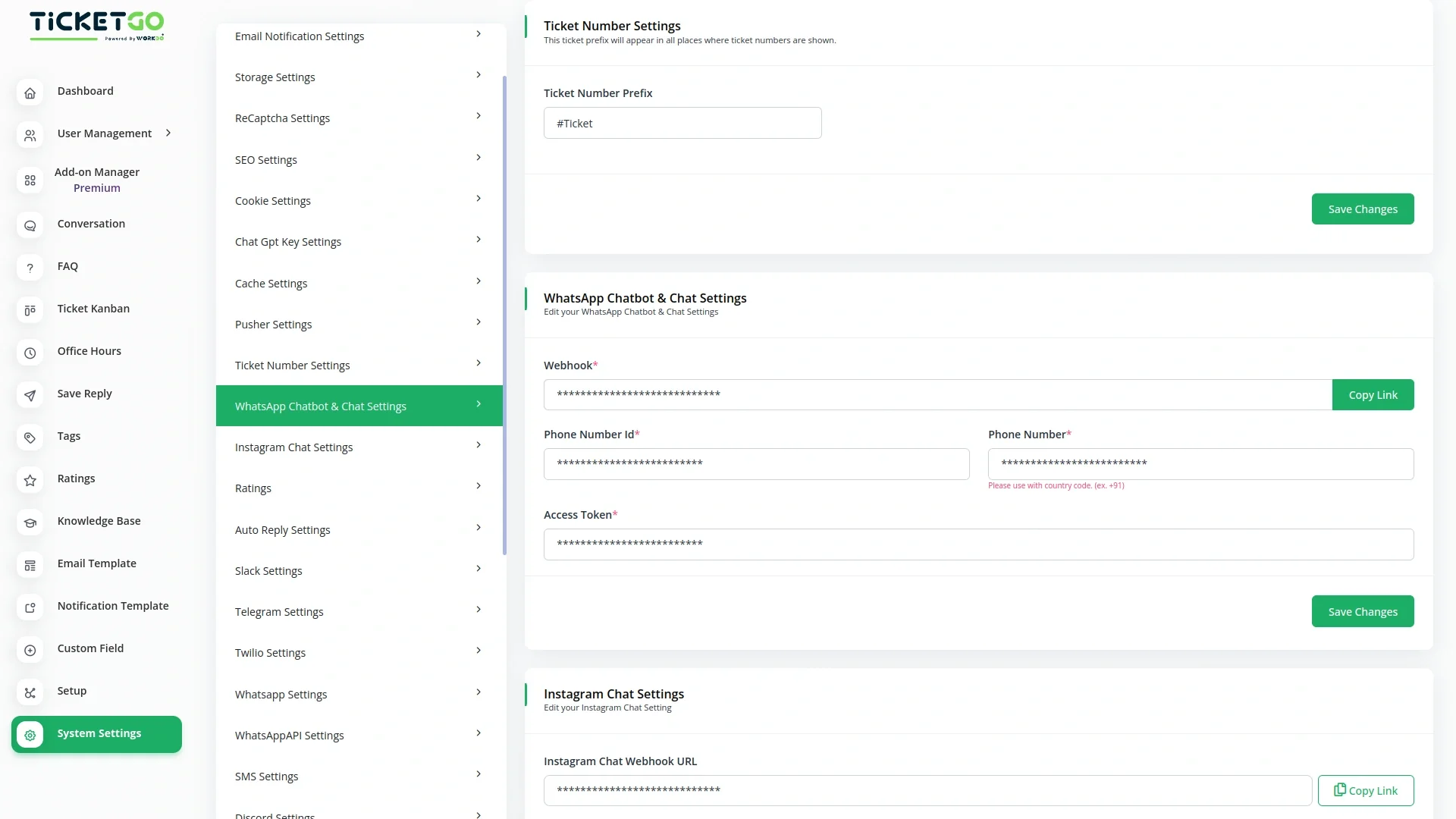To enable WhatsApp chatbot functionality, TicketGo requires specific credentials, including a Webhook URL, Phone Number ID, Access Token, and registered Phone Number. The Webhook URL connects the chatbot to WhatsApp, ensuring real-time communication. The Phone Number ID uniquely identifies the WhatsApp business account, while the Access Token acts as a secure authentication key, allowing the system to send and receive messages on behalf of the business. It is crucial to keep these credentials confidential to prevent unauthorized access.