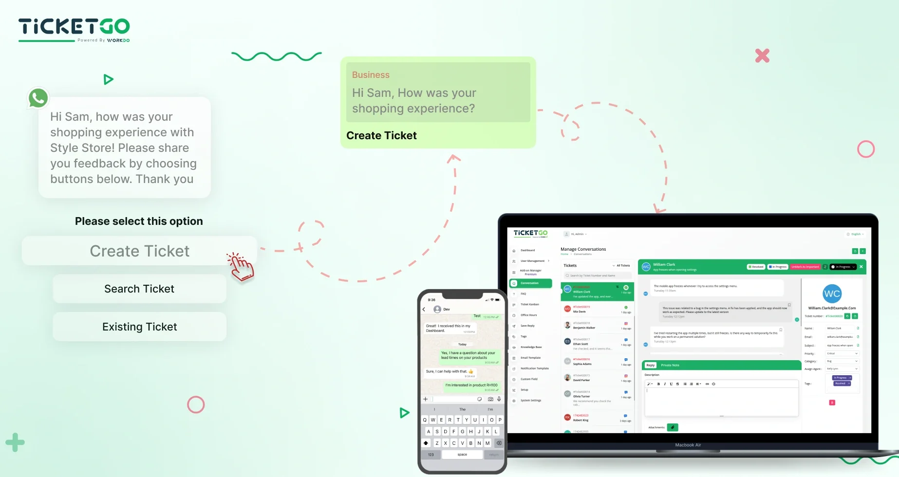 The WhatsApp Chatbot Addon in TicketGo enables customers to create support tickets effortlessly through WhatsApp. Instead of navigating through a website or app, users can simply send a message detailing their issue, and the chatbot will capture the necessary information to generate a ticket. This eliminates long wait times and ensures that queries are logged into the system instantly, allowing for a quick and efficient resolution process.