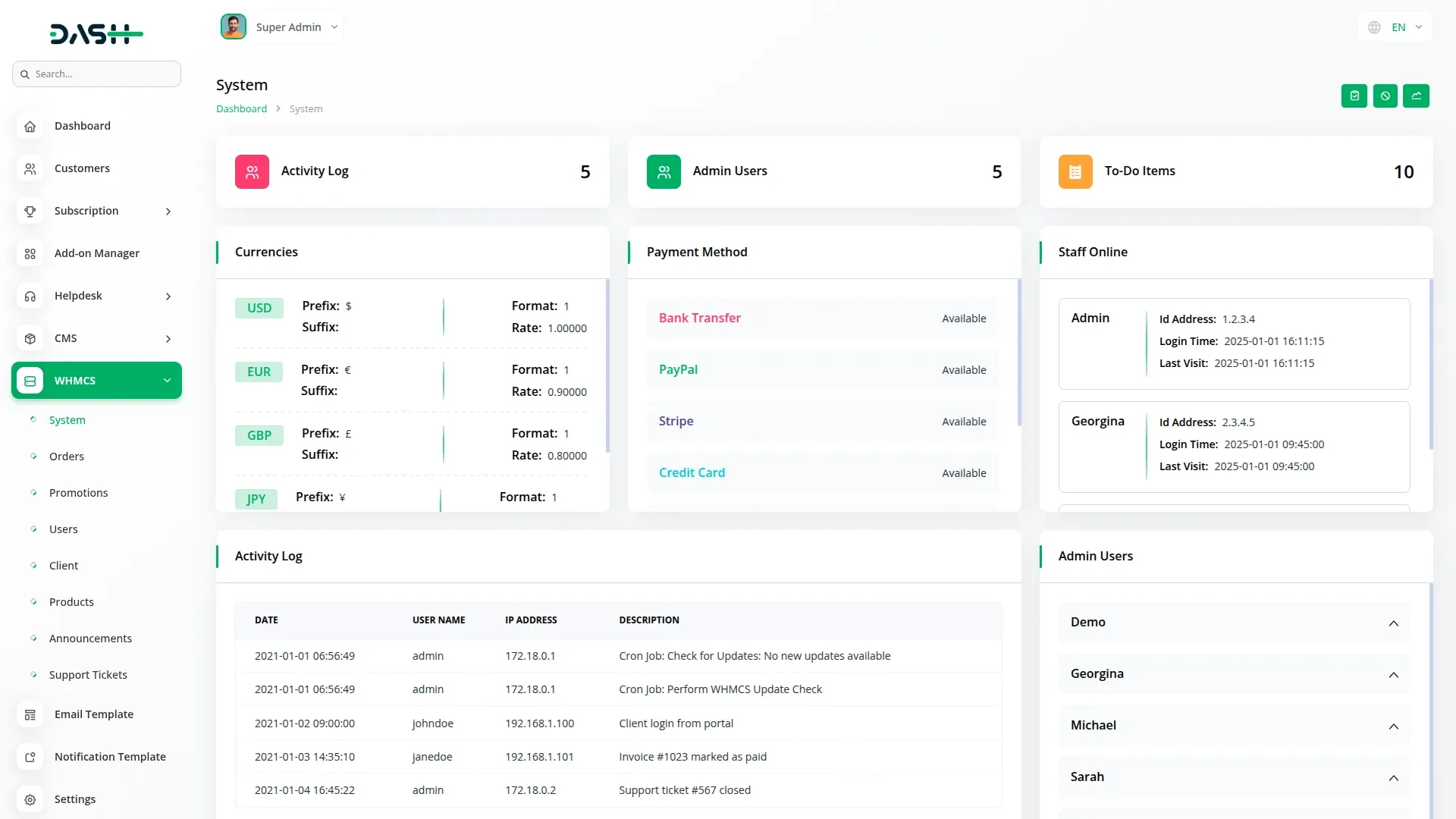 Our Dash platform provides seamless third-party integration with your existing WHMCS system through secure API connectivity. Configure your API identifier, secret key, and WHMCS URL to establish direct API connections with real-time data synchronization. The system offers advanced server monitoring with successful checks, warning detection, and danger identification for optimal performance. Monitor comprehensive analytics, including activity logs, administrative users, staff activities, and currency settings, through a centralized dashboard powered by API data exchange.