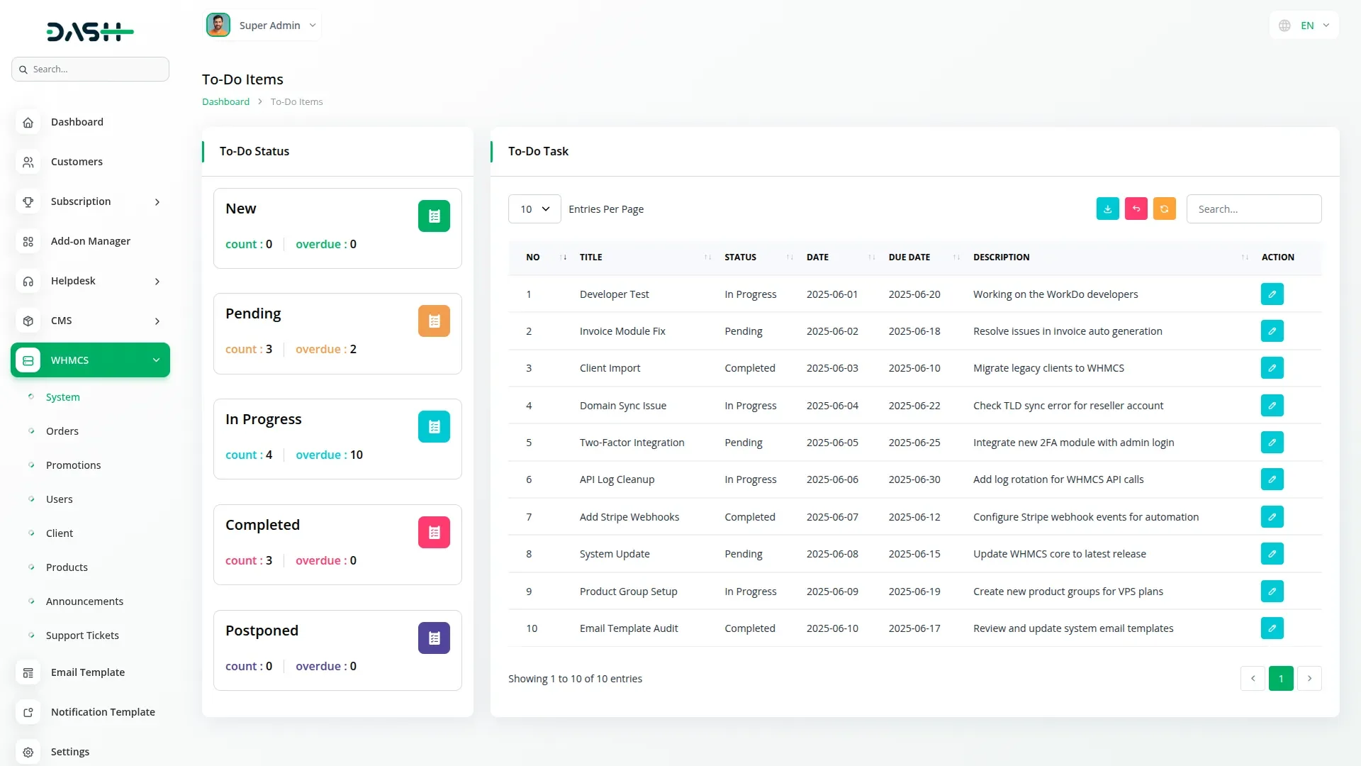 The WHMCS – Dash SaaS Add-On integrates your Dash SaaS platform with WHMCS, the industry-standard automation platform for web hosting and billing. This add-on empowers you to manage clients, automate invoices, handle subscriptions, and provision hosting services—all from a centralized Dash dashboard. It’s the perfect solution for SaaS businesses offering hosting, domain, or subscription-based services.