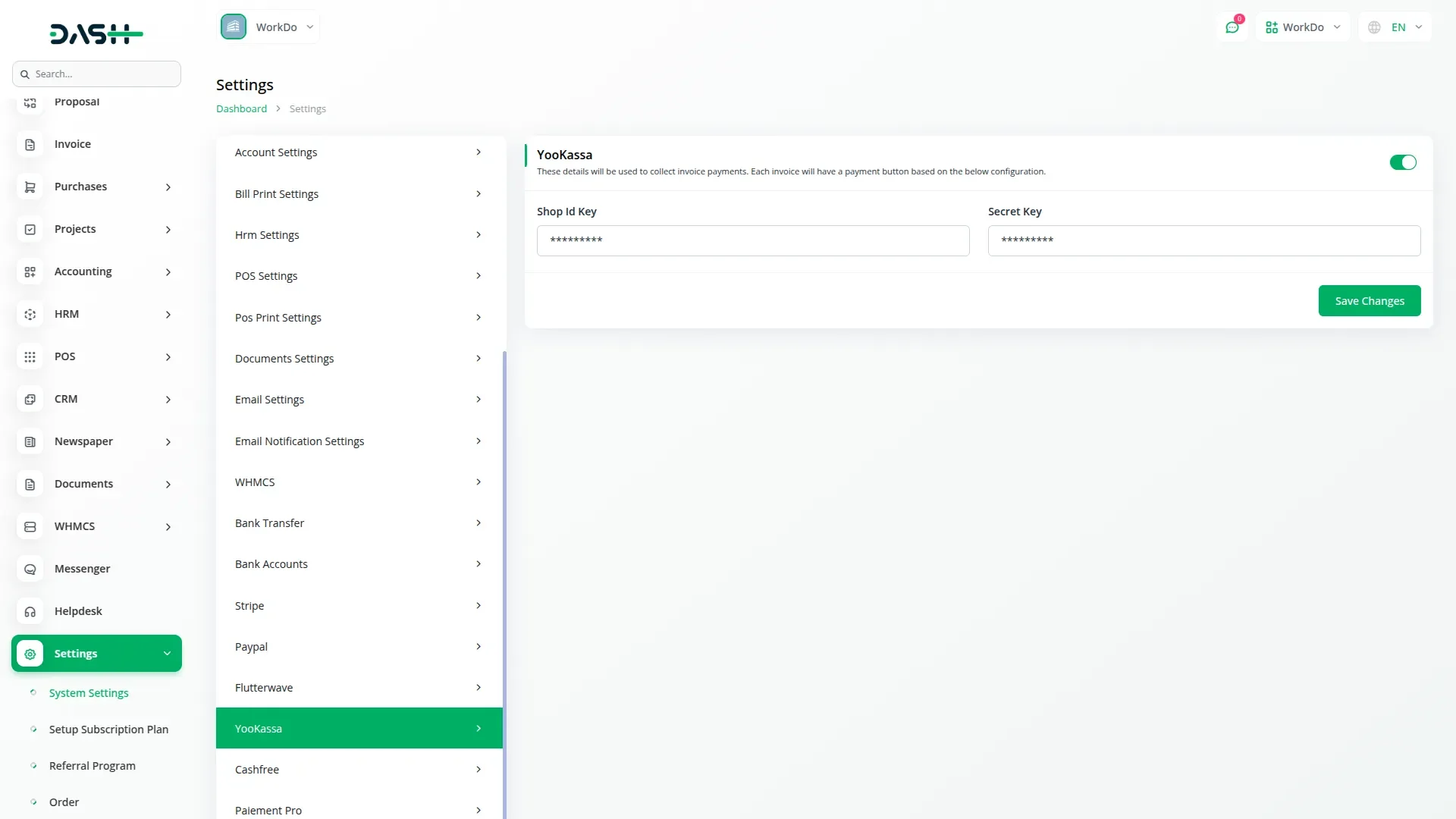 YooKassa – Dash SaaS Add-On.Easily integrate YooKassa payment gateway into your Dash SaaS platform with this powerful add-on. Enable secure online payments in Russian Rubles (RUB) using local methods like QIWI, WebMoney, SberPay, Tinkoff Pay, and international credit/debit cards. Ideal for businesses targeting the Russian and CIS markets, the YooKassa add-on streamlines transactions across invoicing, LMS, subscriptions, and more. Super Admins can quickly configure the Shop ID and Secret Key for seamless and reliable payment processing. Boost conversions with a localized YooKassa integration for Dash SaaS ERP.