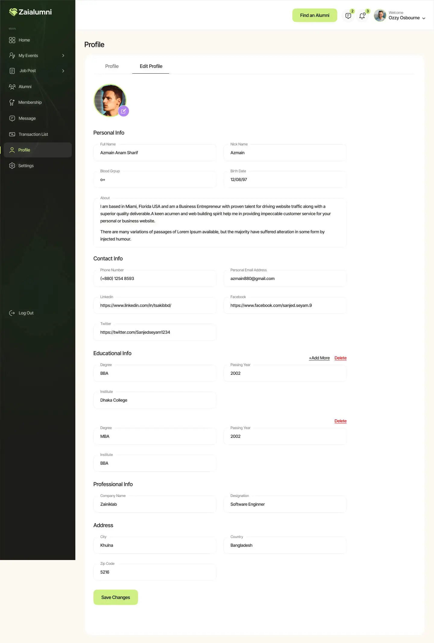 Zaialumni is a user-friendly system that helps alumni easily connect and manage there activities. It has a nice design and strong security, including Two-Factor Authentication for extra safety. Alumni can sign up and get approved by submitting the necessary documents, which allows them to join the alumni community. They can share updates and talk with other alumni in the community hub. Planning events is made simple with automatic ticketing using QR codes and barcodes. The system can work with different languages and currencies and keeps everyone informed through email notifications. Security is important, and administrators can easily control the system with a powerful dashboard. There are also features for flexible membership plans, posting job listings, one-to-one private messages, tracking transactions, and using different payment options. Overall, Zaialumni makes alumni engagement and management easy and comprehensive.