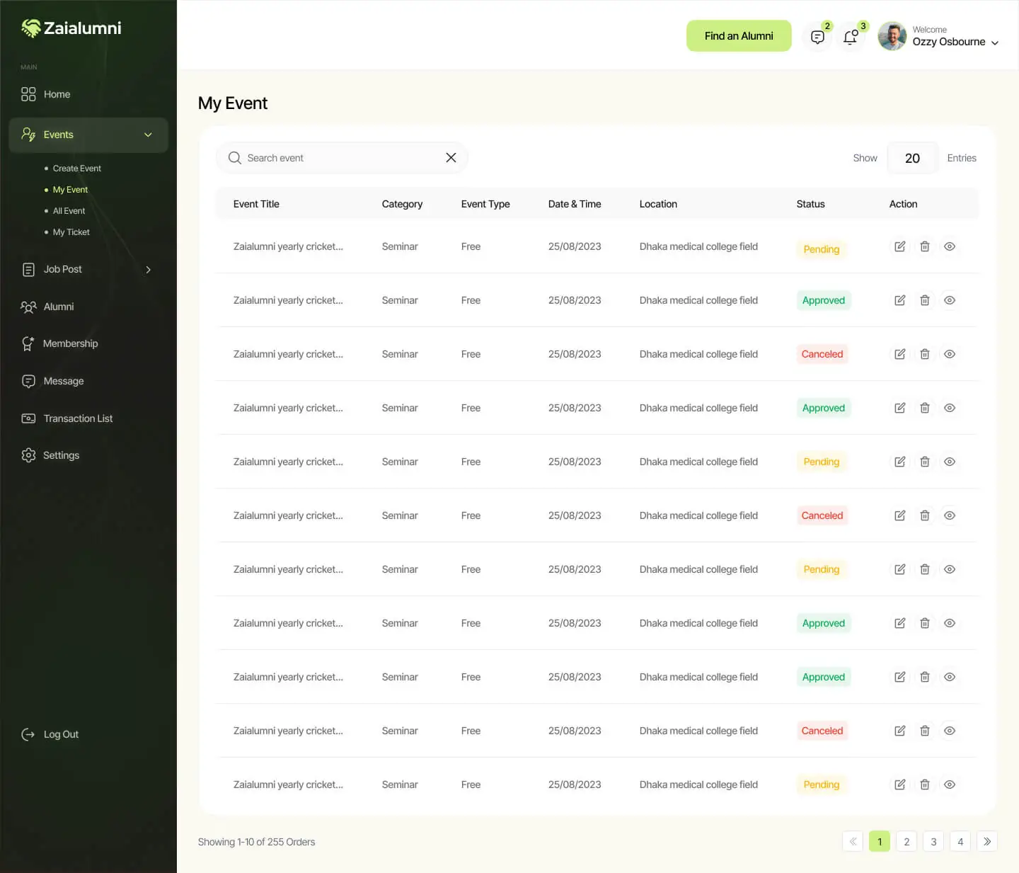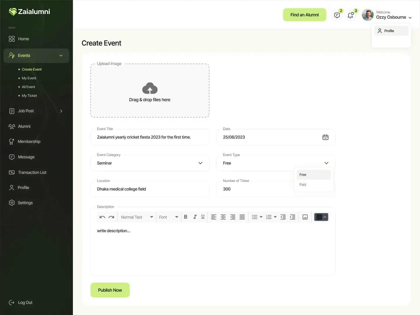 Event Planning and Management: Users can create and manage alumni events, including details such as date, time, location, and registration.