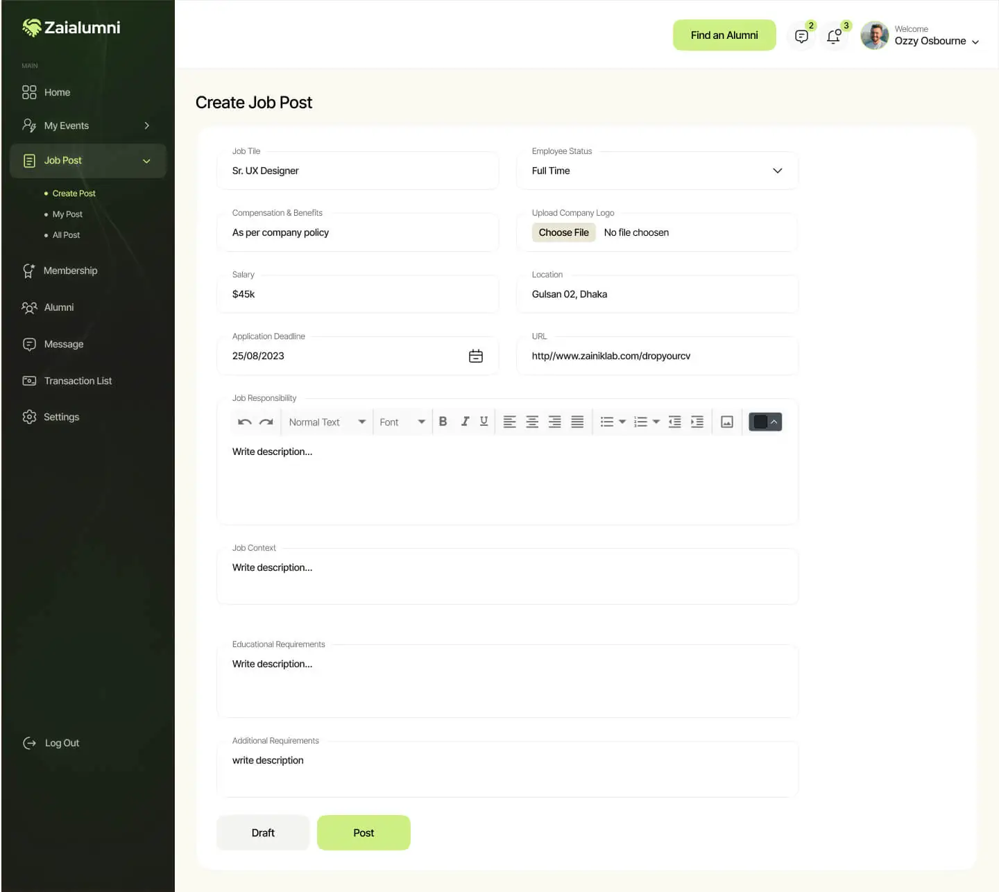 Job Posting Platform: Employers can post job openings, and alumni can search and apply for positions through the system.