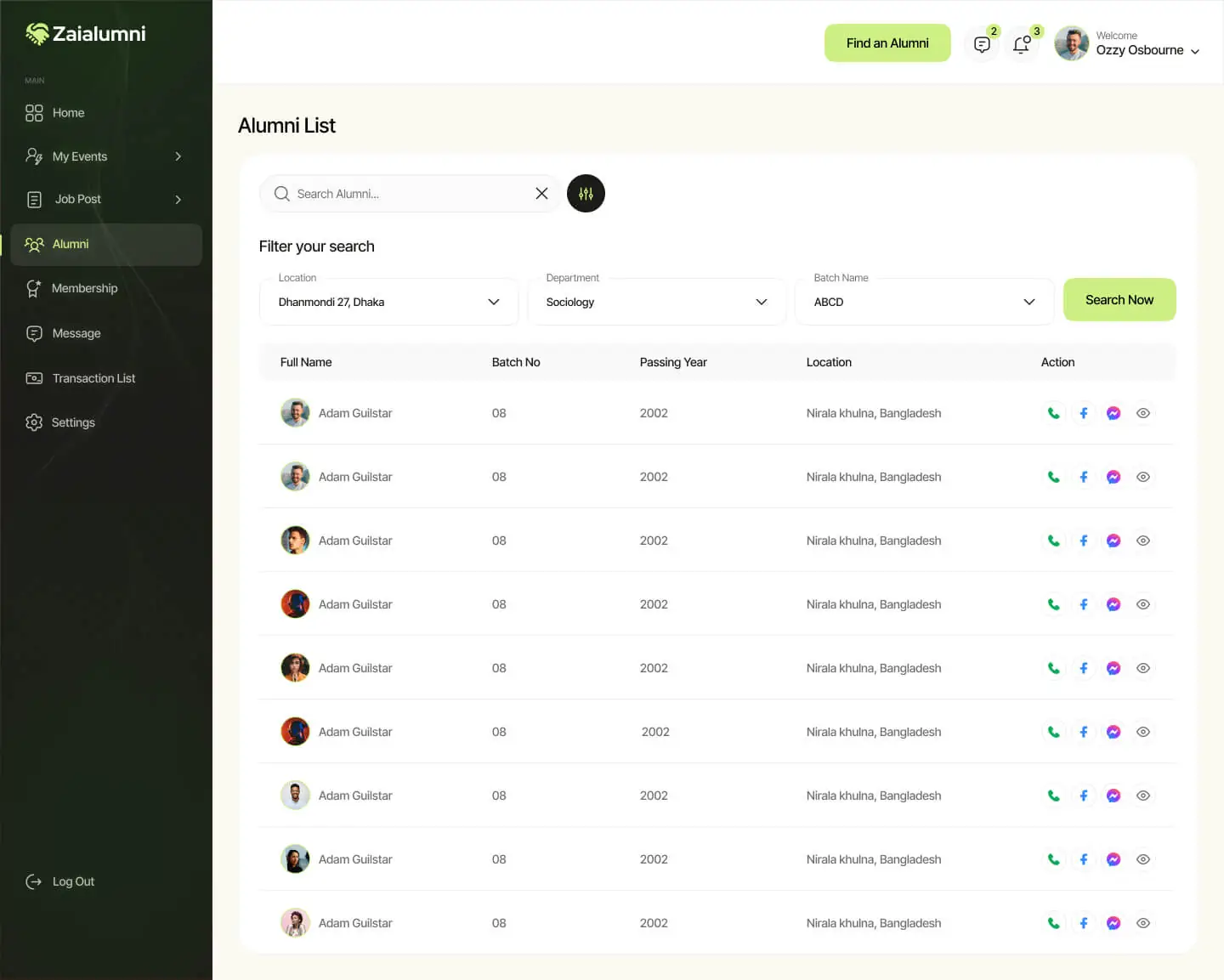 Advanced Alumni Search Functionality: Users can search for fellow alumni using various filters such as graduation year, location, and more.