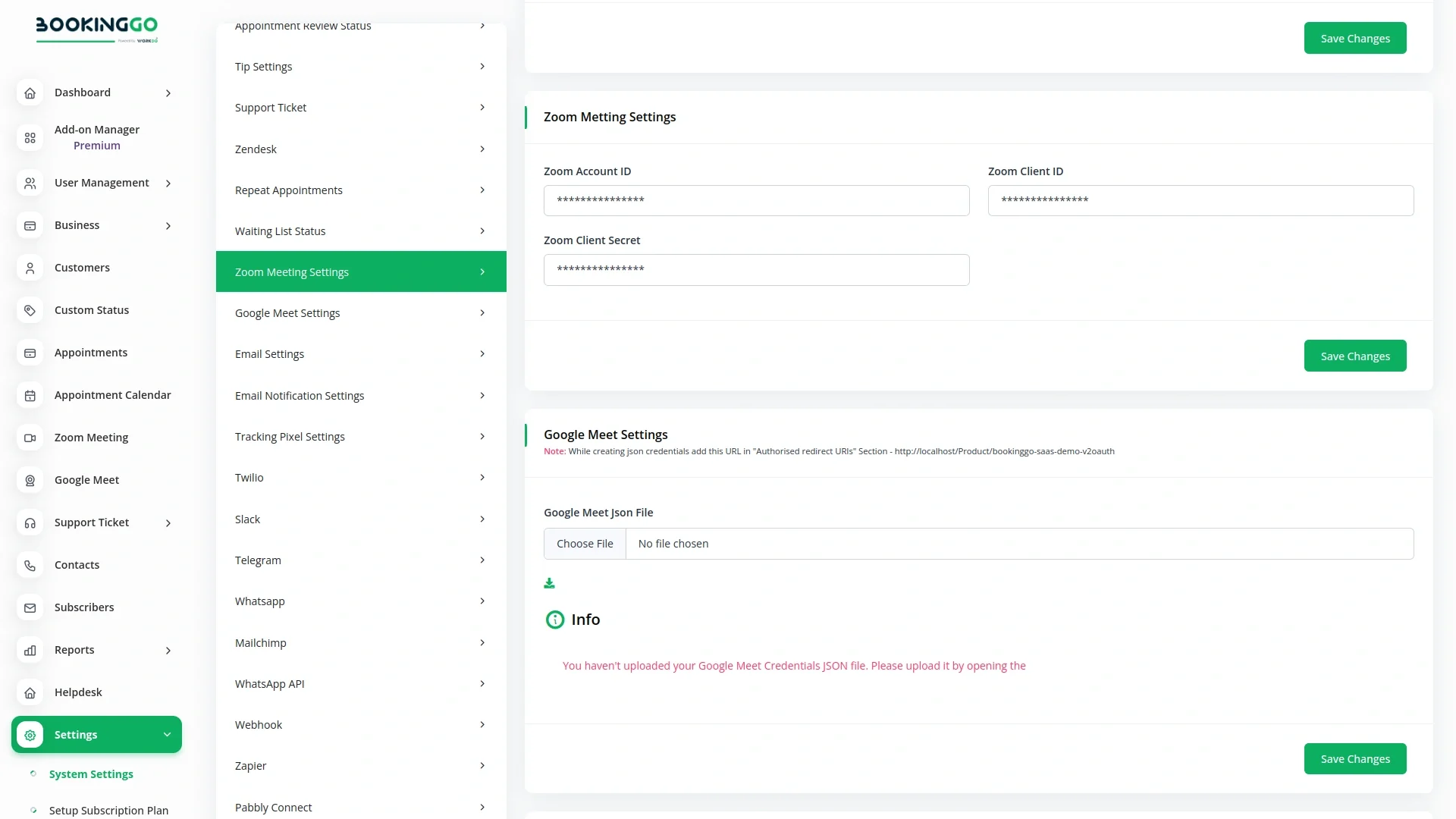 Introducing Zoom Meeting Integration for BookingGo SaaS! This feature seamlessly integrates Zoom's powerful video conferencing capabilities into the BookingGo platform, offering users a comprehensive solution for meeting management. With Zoom Meeting Integration, users can schedule, host, and join Zoom meetings directly from their BookingGo account, streamlining the entire meeting process.